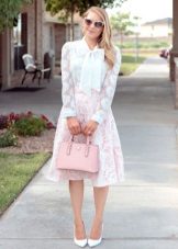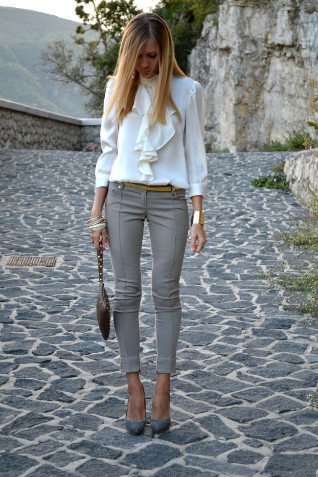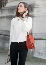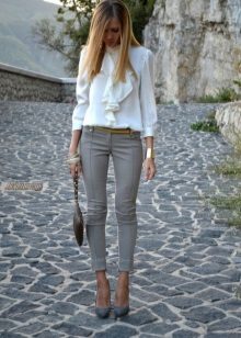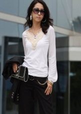 - Accessories just have to be in the image. But you should be careful with them. In priority, refined and small sets of precious metals or pearls. Massive jewelry is also combined with blouses, the main thing is not to overdo it.