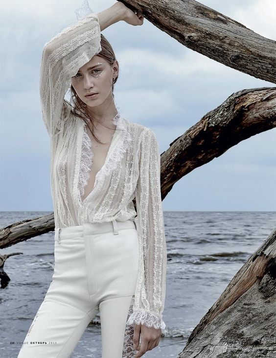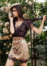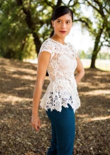 The seductive lace blouse of dark blue color which strap emphasizes a waist - all eyes will be fixed on this bow. Both skirt and trousers will fit into the image. As for accessories, there is complete freedom of choice - either large jewelry, or jewelry.