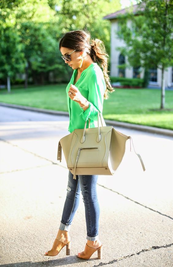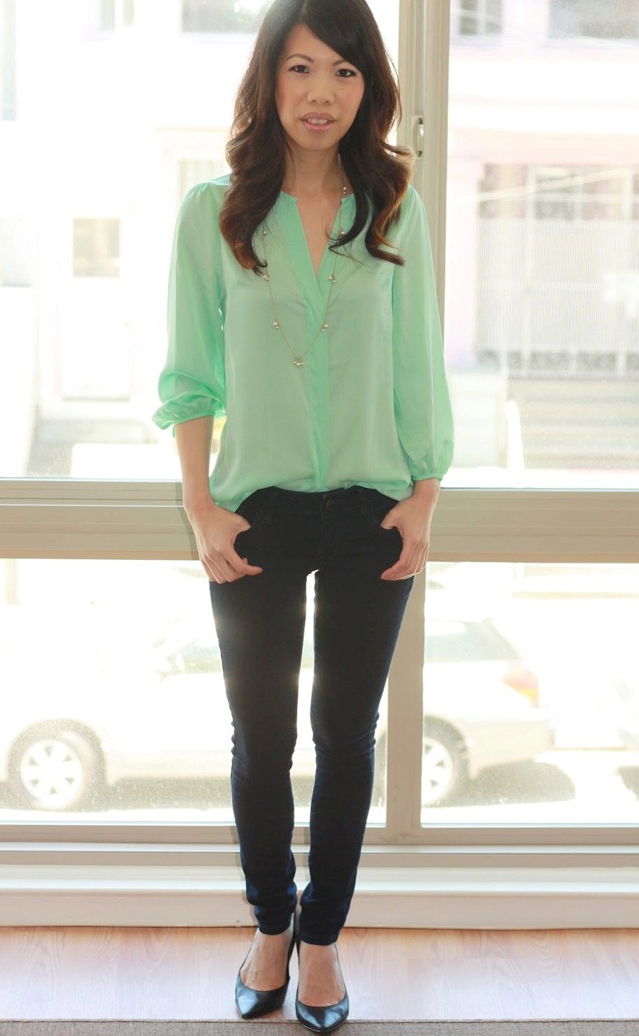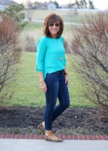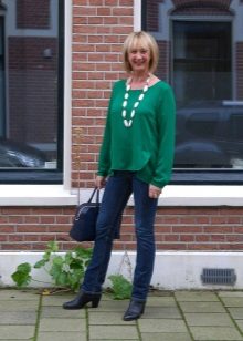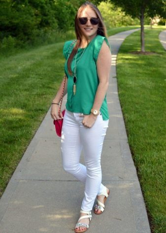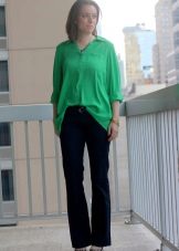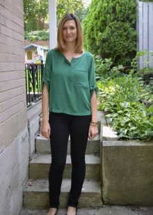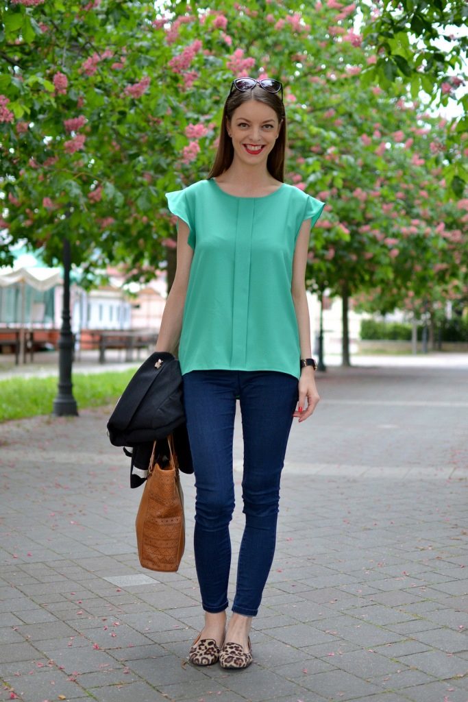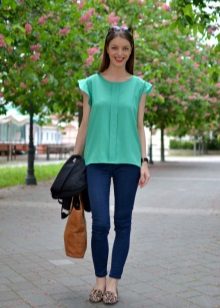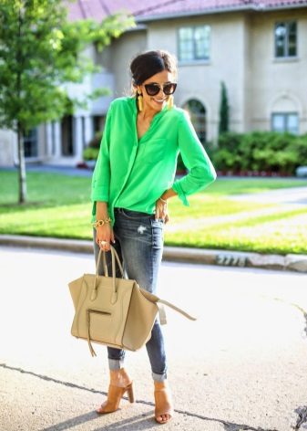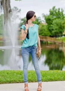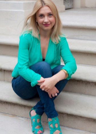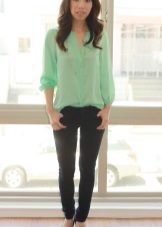 Fans of jeans do not need to deny themselves the pleasure of wearing them with a green blouse. Mint blouse looks very nice in combination with skinny jeans.