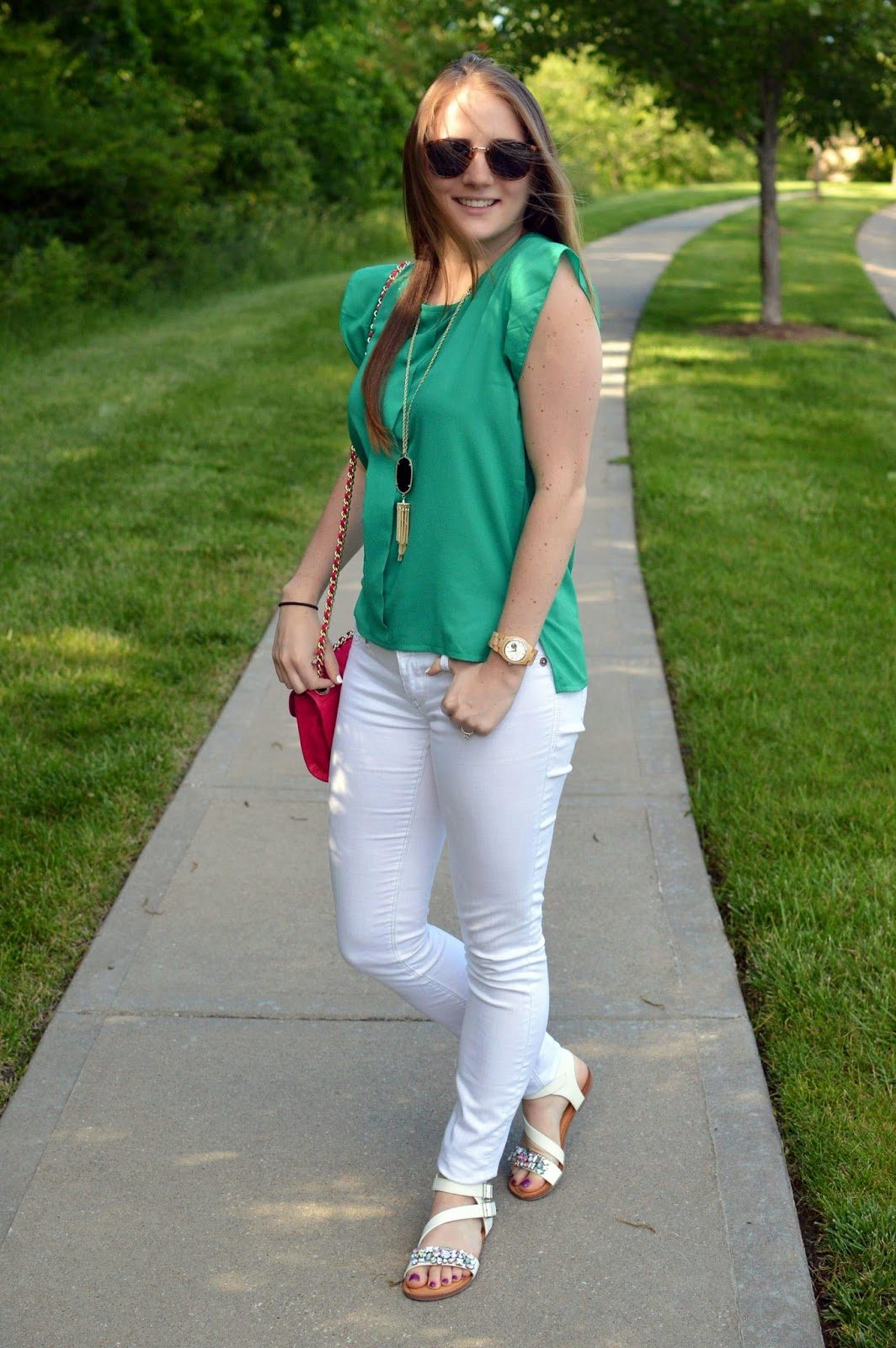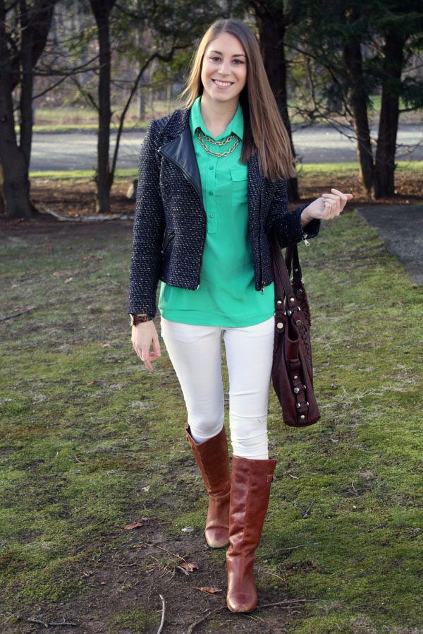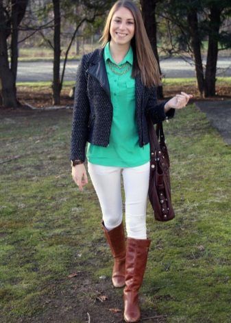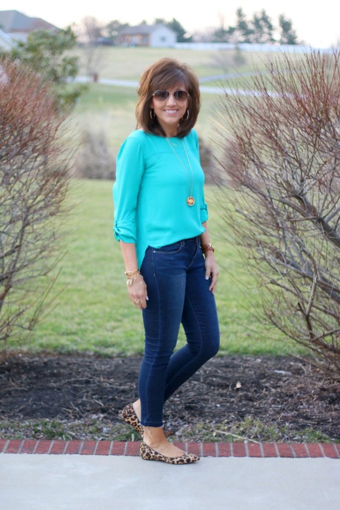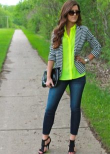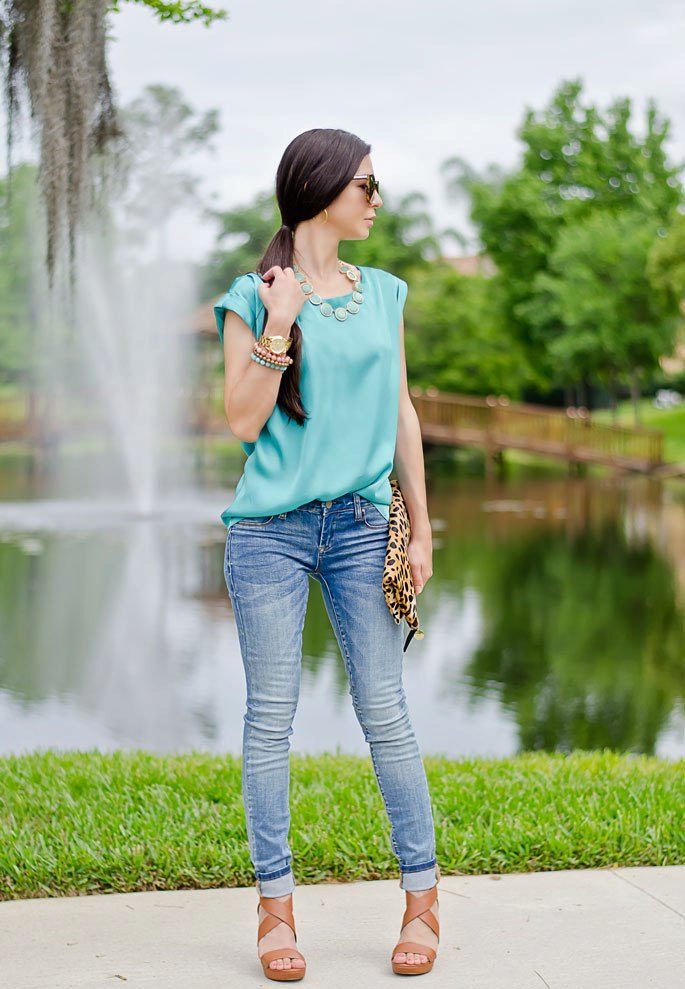 Fans of jeans do not need to deny themselves the pleasure of wearing them with a green blouse. Mint blouse looks very nice in combination with skinny jeans.