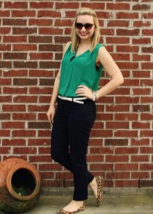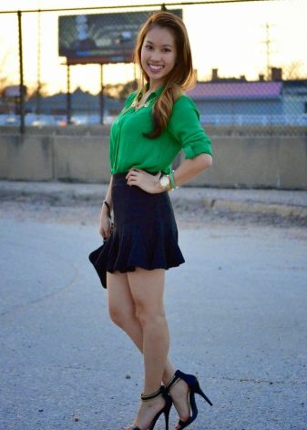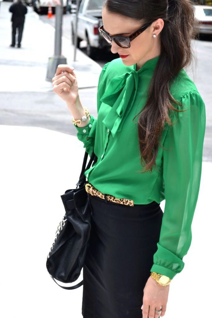 A green blouse easily complements the business look. For this outfit, it is better not to take clothes of bright colors, and stick to classic shades. Shoes and accessories should not be massive, otherwise the femininity of the image disappears.