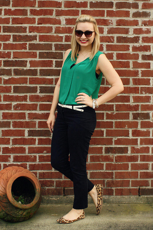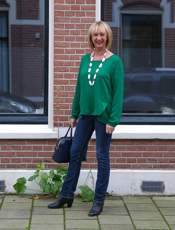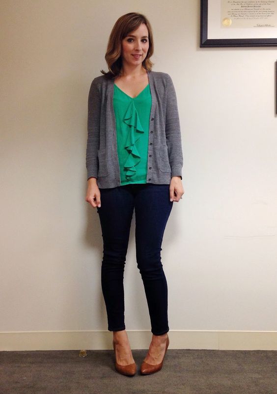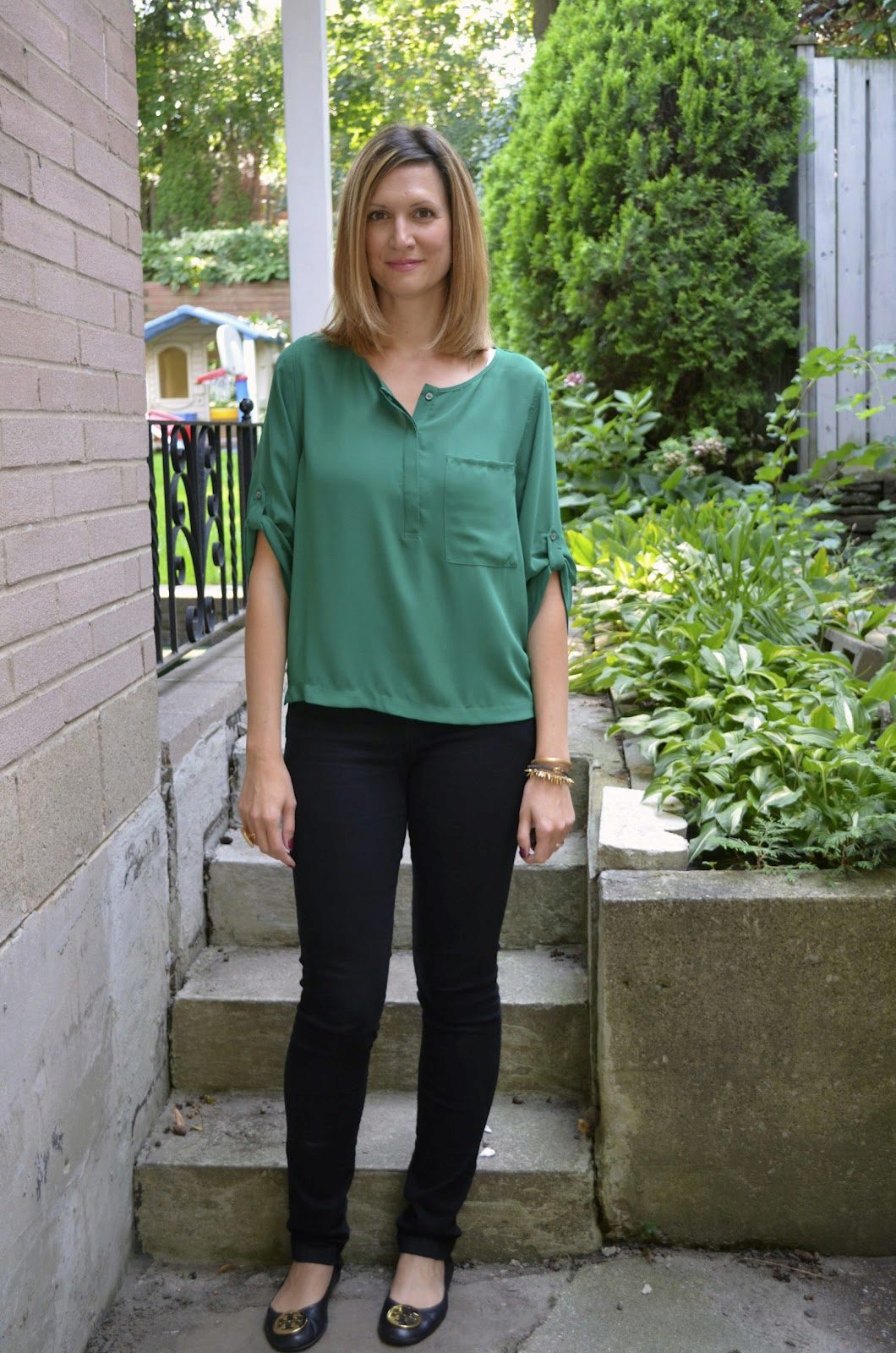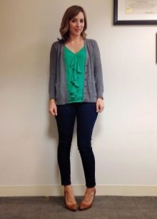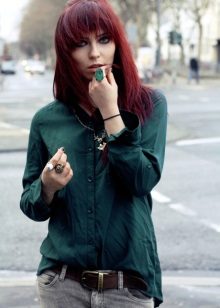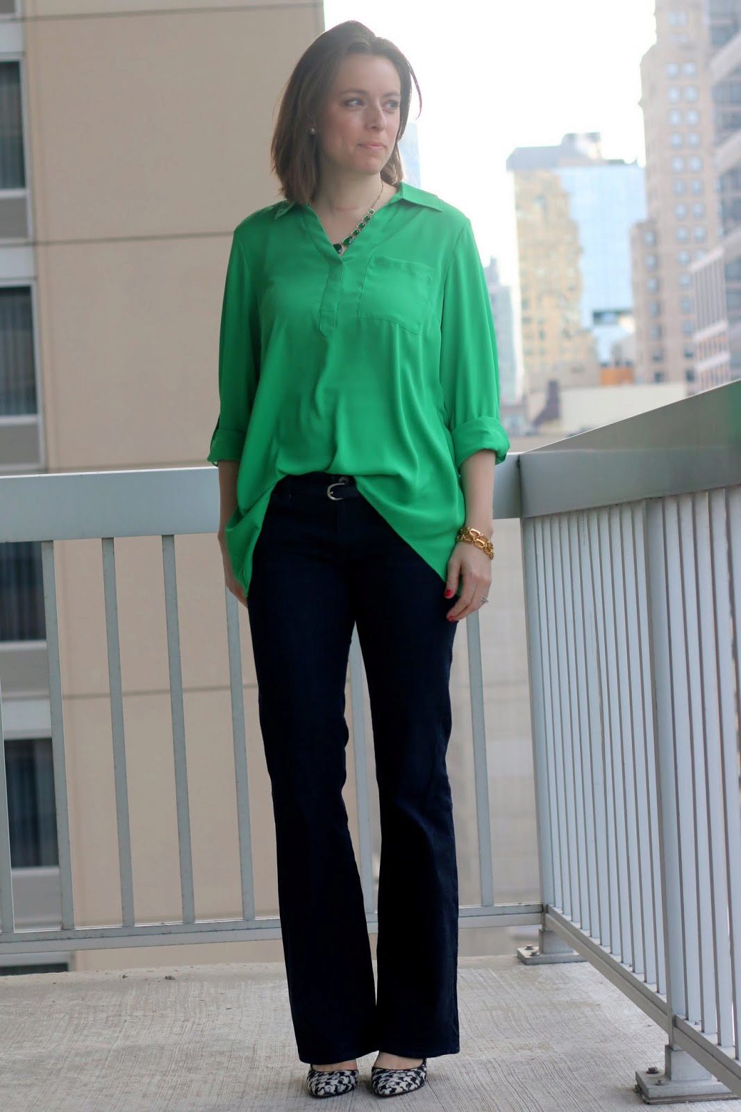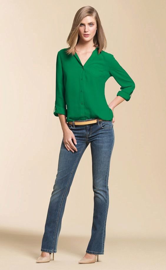 To create a formal business style, a dark green blouse is perfect, as well as dark trousers or jeans of classic cut. It is appropriate to add clothes with heels or low platform shoes and a brown (or any other neutral shade) handbag of medium capacity. Gold or silver jewelery is best suited as a supplement.