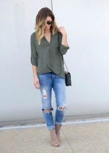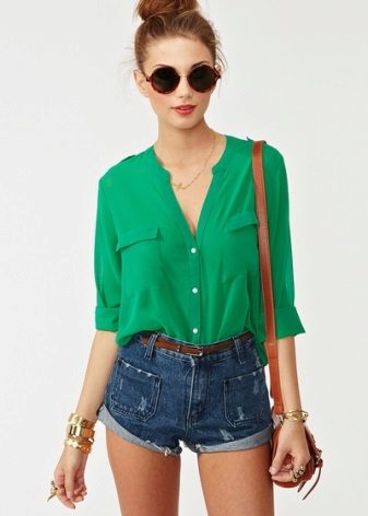 Chiffon blouse is versatile. You can wear not only with shorts, but also jeans - boyfriends or classic. Jewelry should be chosen not massive, gold or with small stones. Bag and shoes should be moderate shades, preferably from a palette of brown.