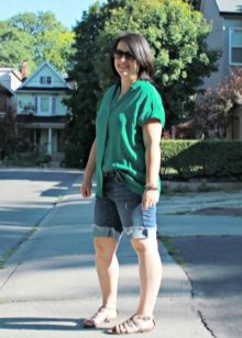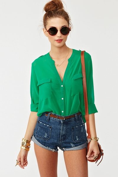 Young ladies are perfect set of blouses with short shorts. His perfectly complemented sandals on a flat course and a small contrast bag. Particularly successful is the combination of a green top with a beige or muted blue bottom.