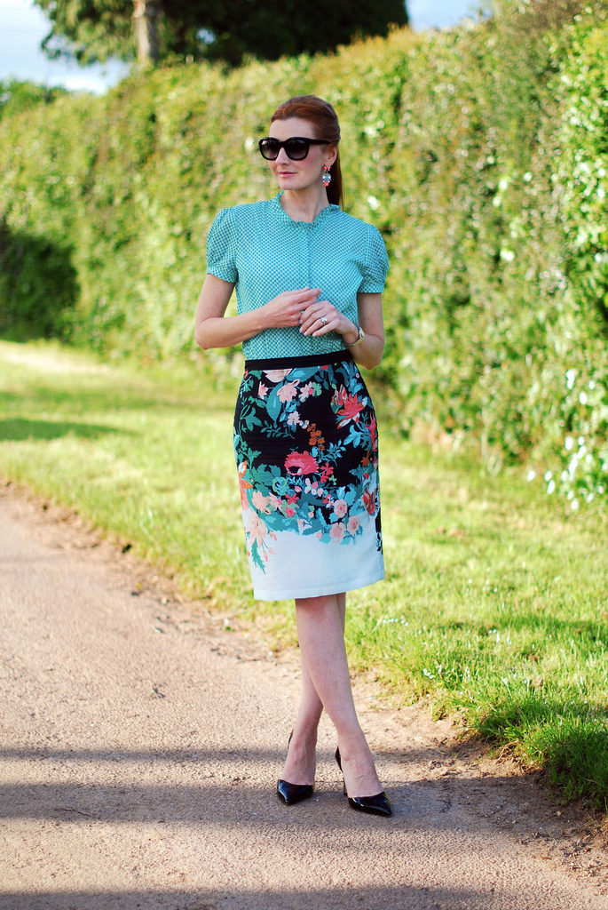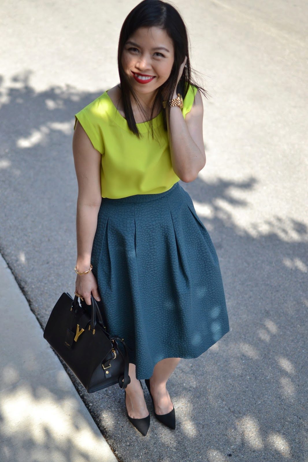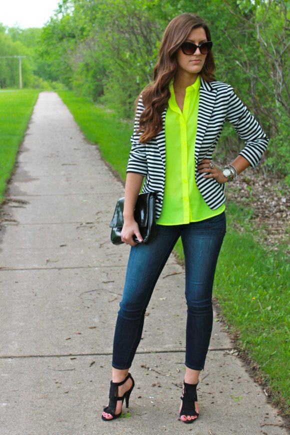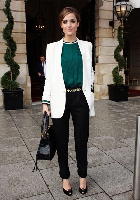 A suitable addition to this set will be a dark jacket. Handbag and shoes need to pick contrast, such as pastel or brown.