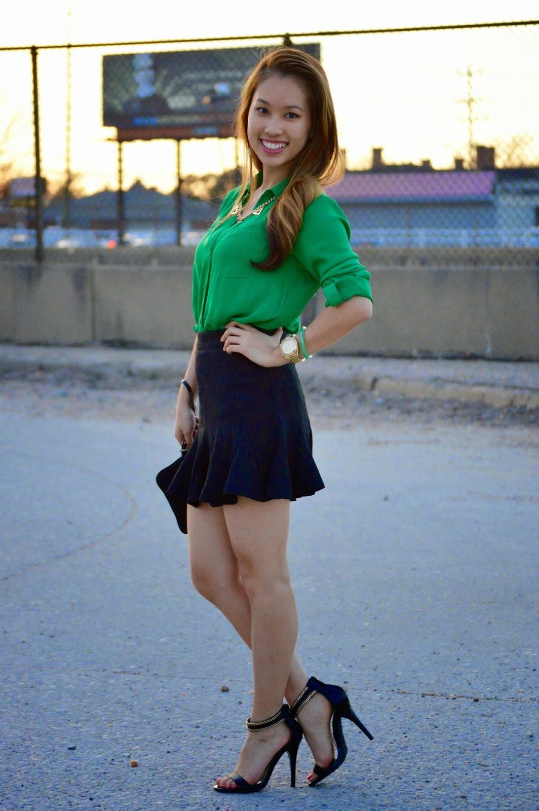 Putting on a romantic date, wear a blouse with ruffles and a gray or beige pleated skirt.