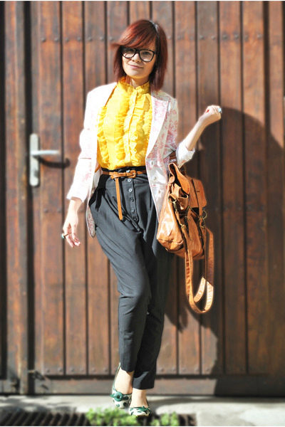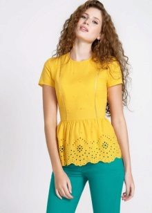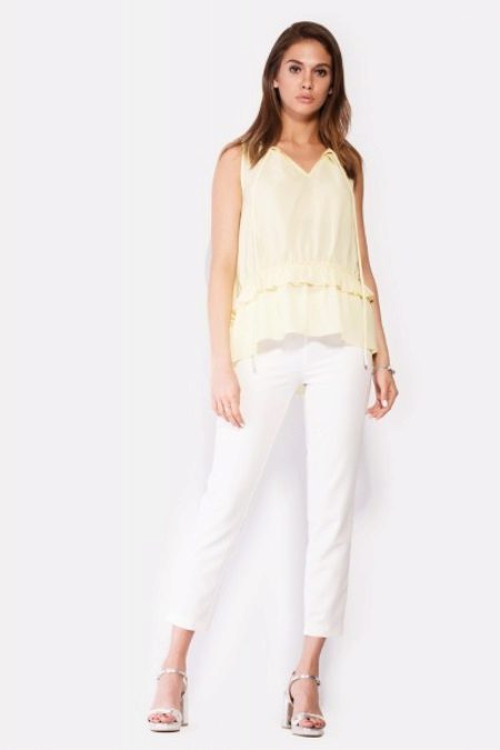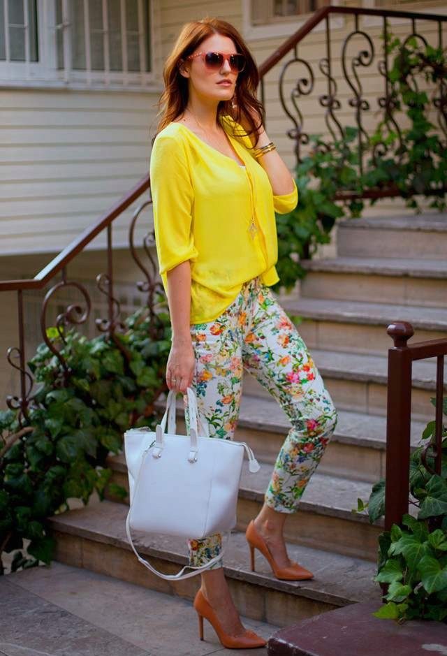 - Trousers do not have to be very simple, they can be printed with flowers, for example. The idea is that one of the colors in the print be combined with a yellow top.