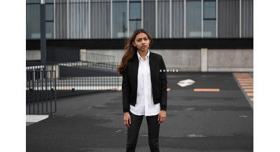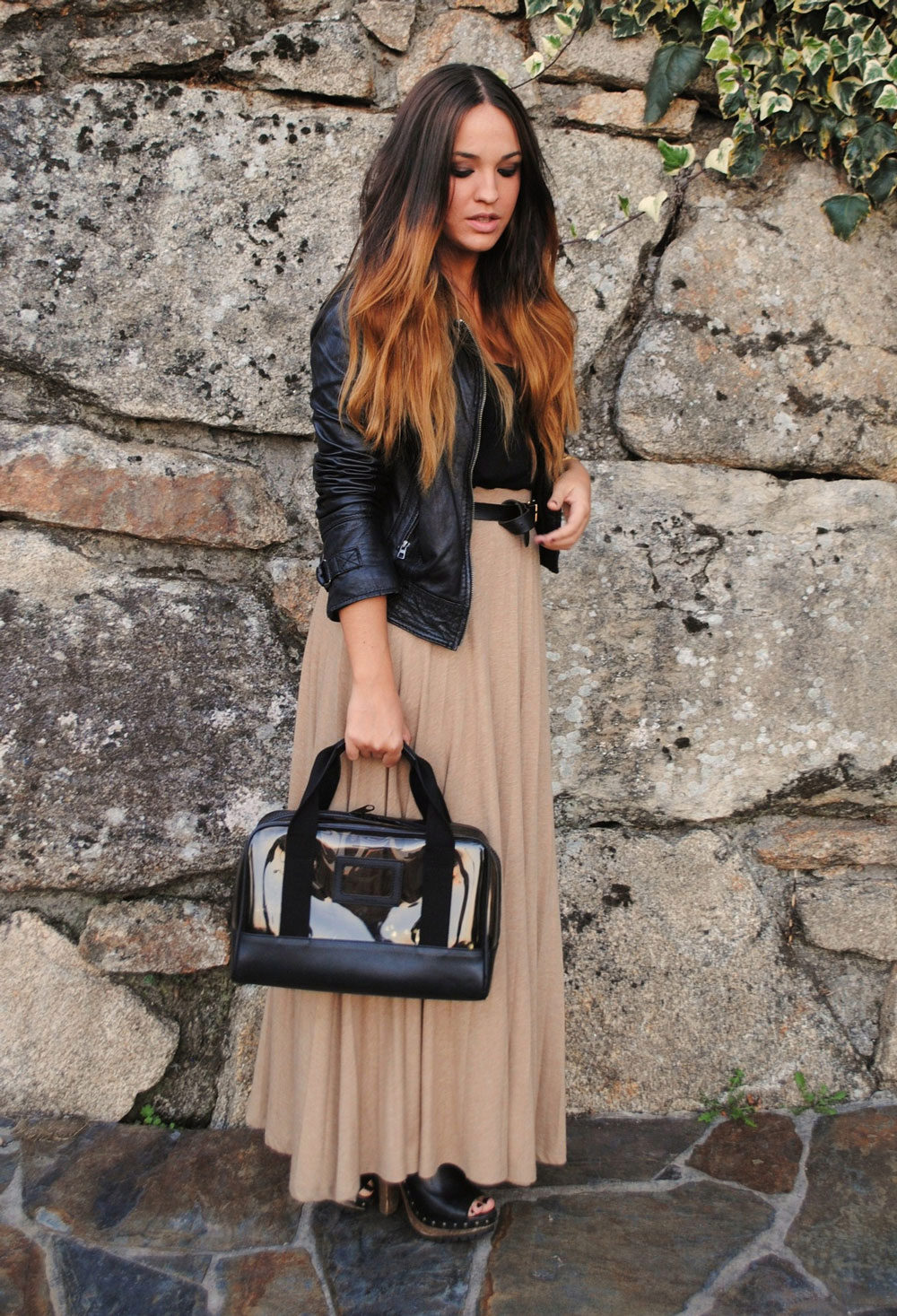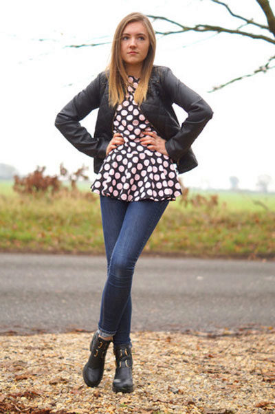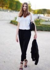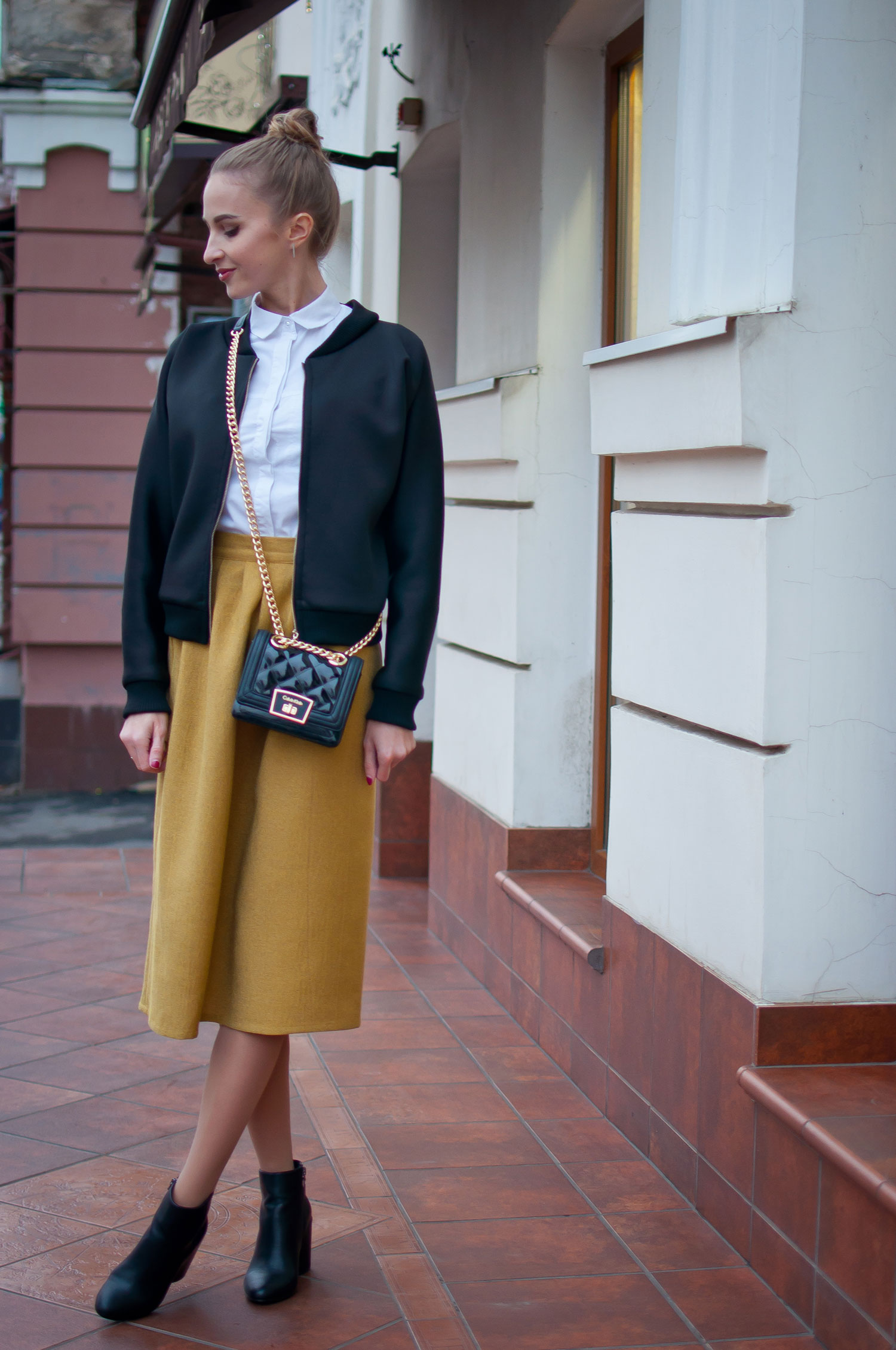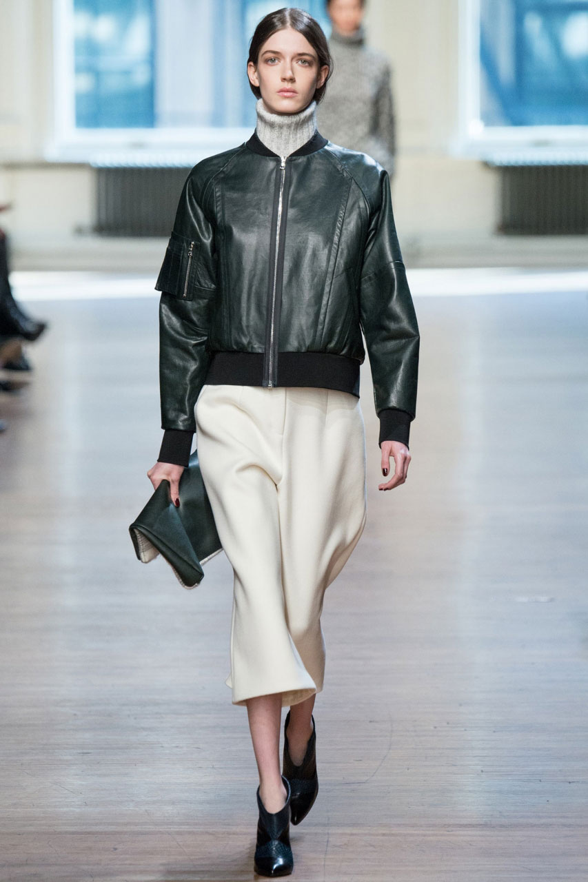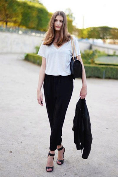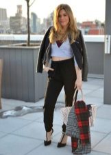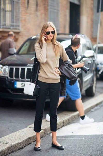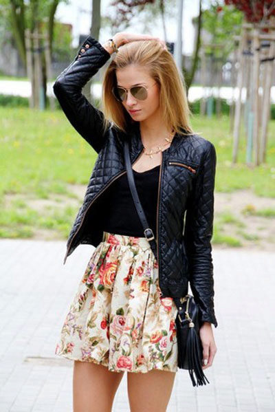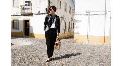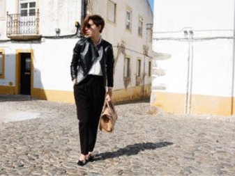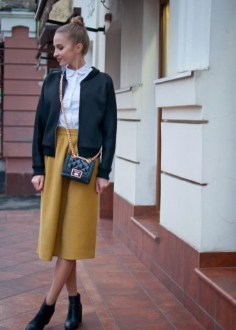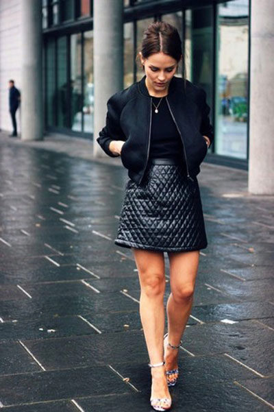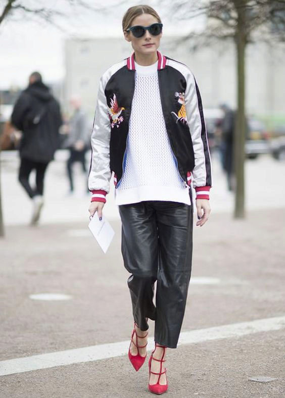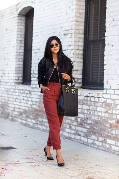 Are you a creative person? Then choose cropped culottes, shoes with heels and a black bomber jacket with a zipper.