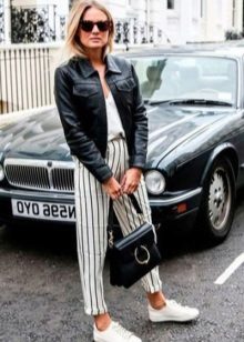 Lovers of sports style can offer sneakers, a hat, pants with stripes and a black bomber jacket.
