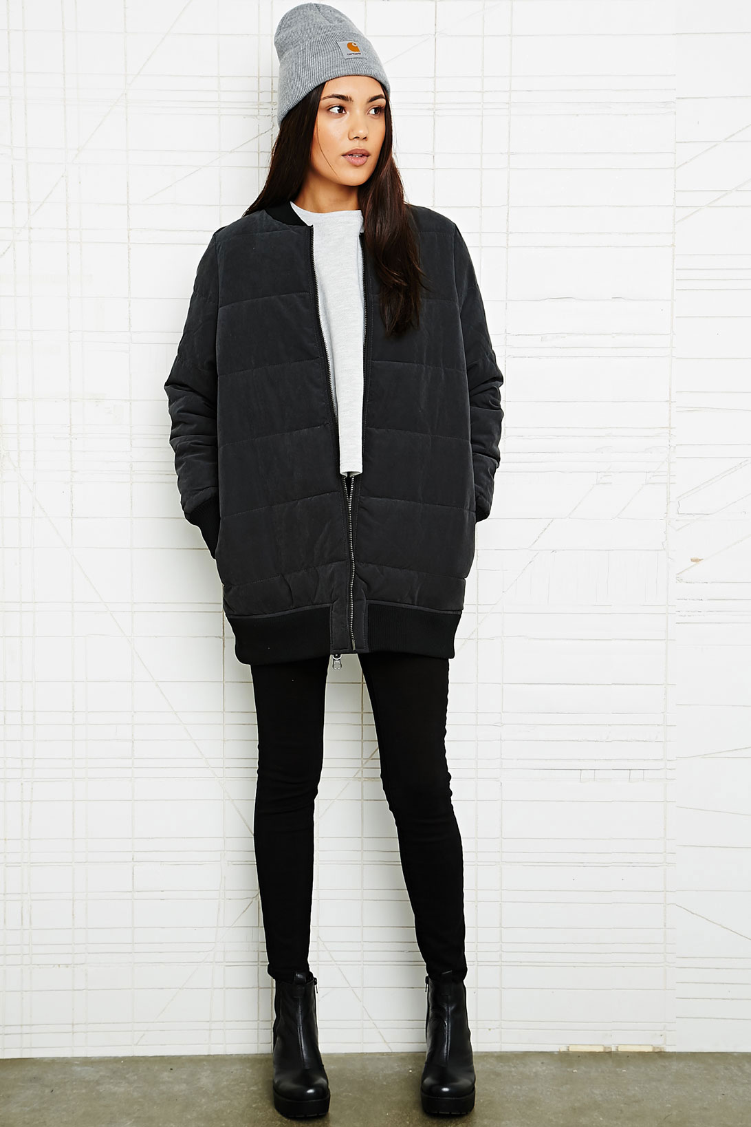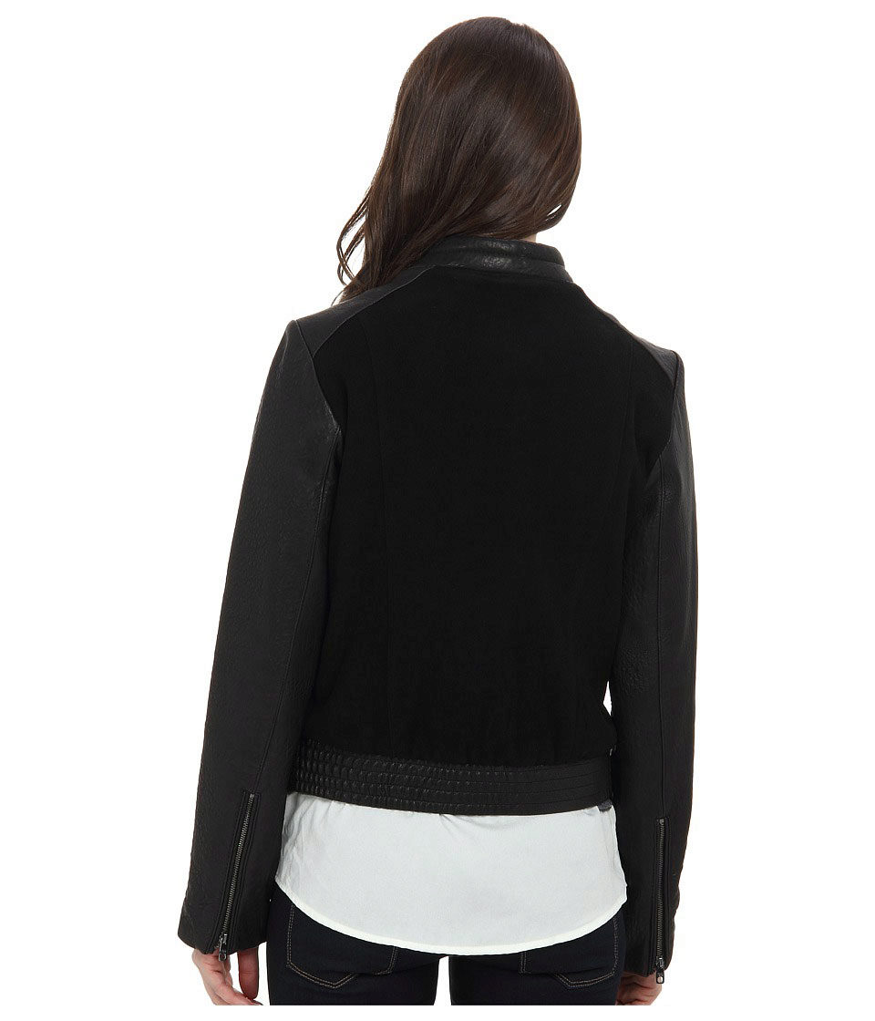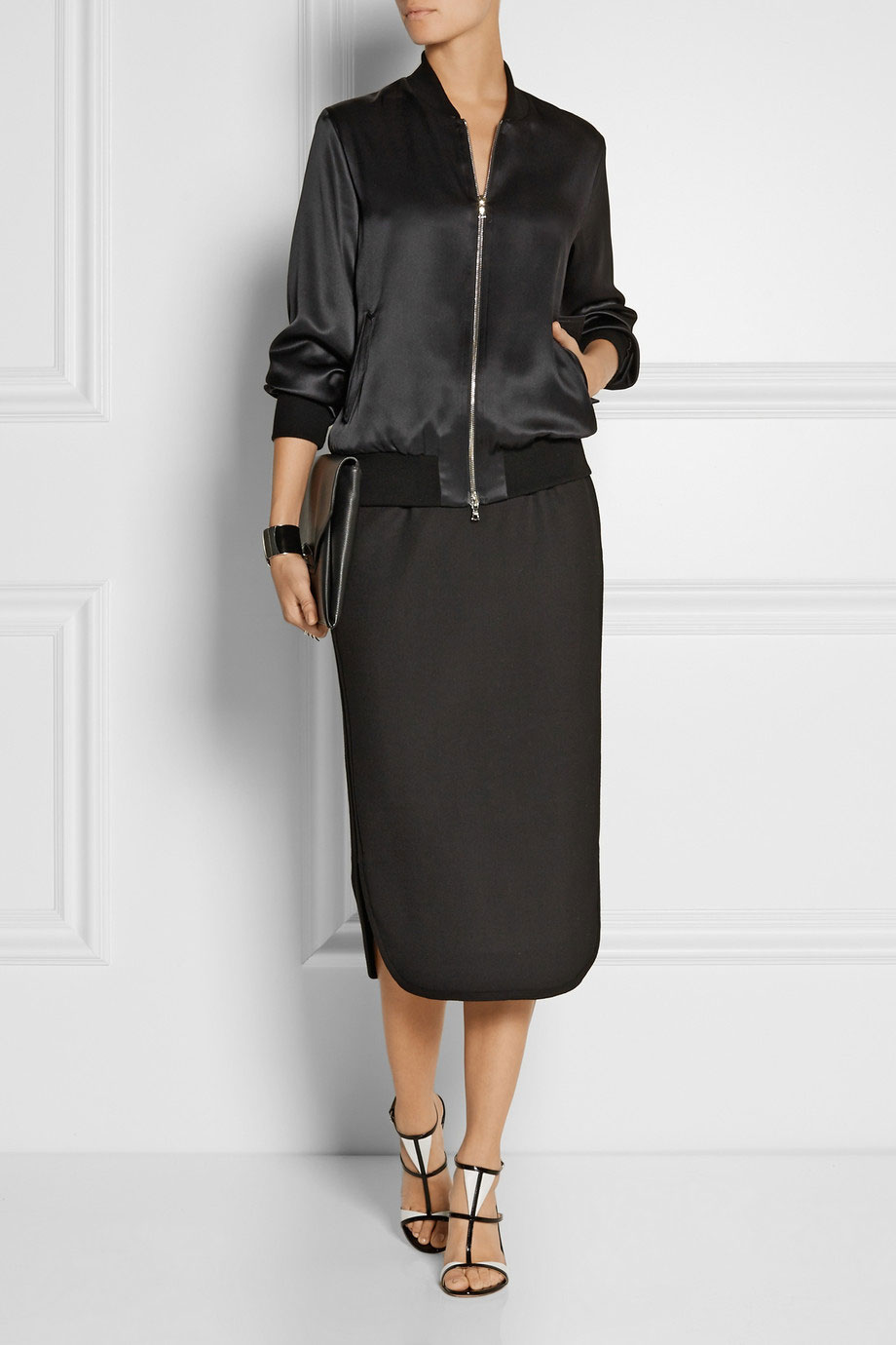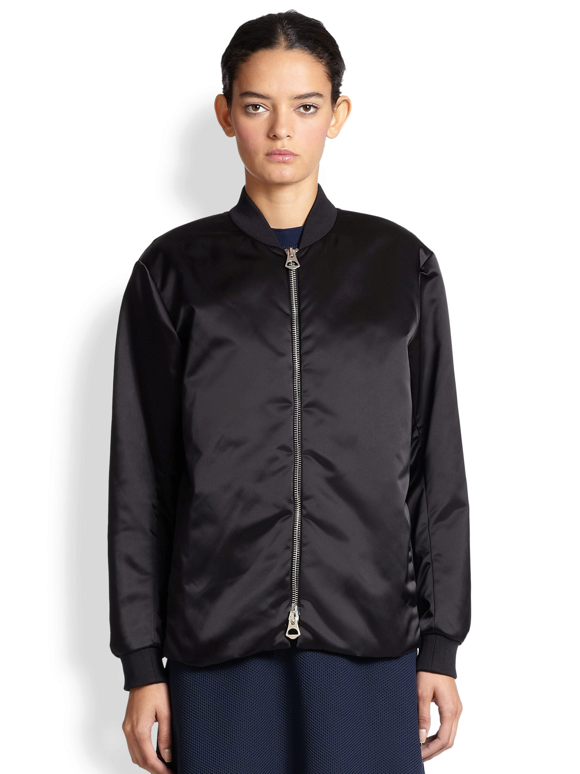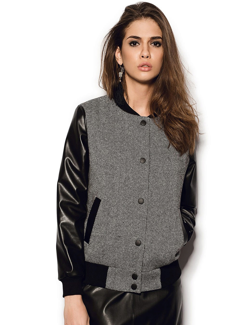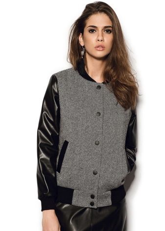 - A black bomber jacket with white sleeves is a classic combination for a sporty style and a straight style.
