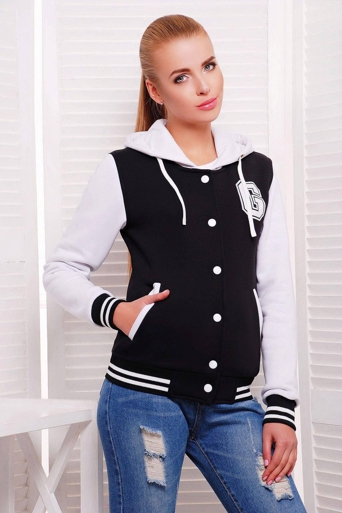 - The black and white version is a bright mix of two colors. White color can be presented sleeves, a collar or a hood on a jacket.