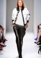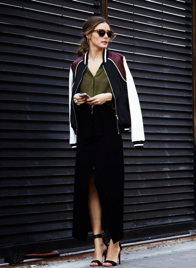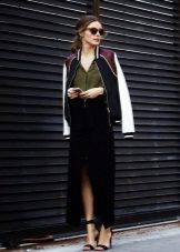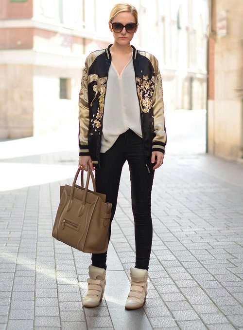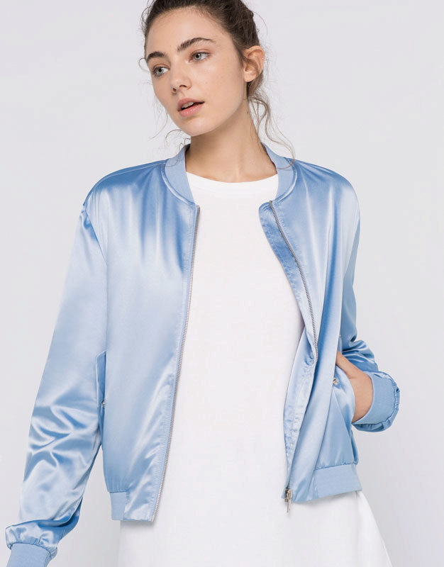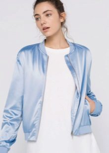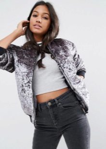 Silk or satin. These materials are capable even of a sporty model to make an elegant thing suitable for publication. If we are talking about a style different from boho, then it is better to combine bombers from these fabrics with the same exquisite materials of other things, for example, a silk bomber jacket will perfectly fit to a chiffon blouse and trousers made of fabric with shine.