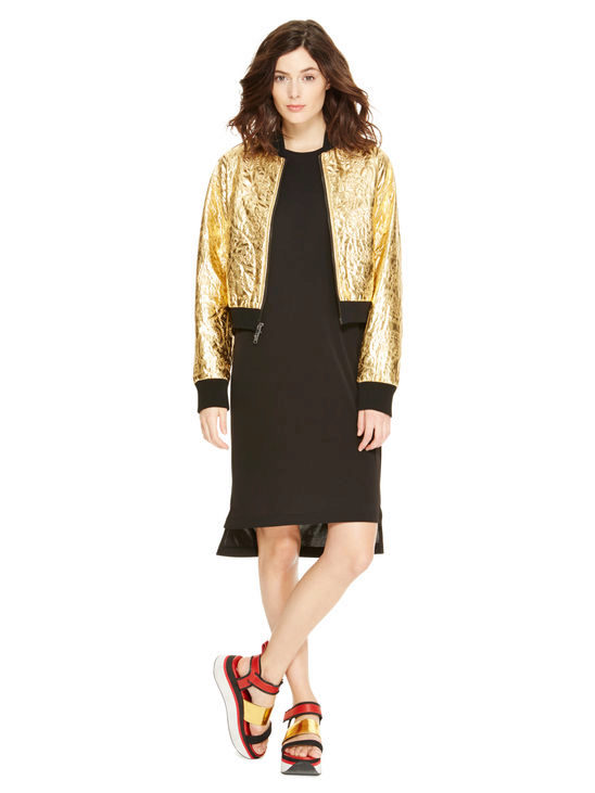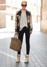 - Gold color bomber able to emphasize the glamor of the whole bow, it should only be borne in mind that there should not be too much gold, as well as brilliant things in general. Of course, for a model made in such a non-standard color, you need to choose the things that are as calm as possible in terms of colors - pants or a skirt, a blouse or a t-shirt, shoes or sneakers.