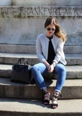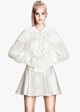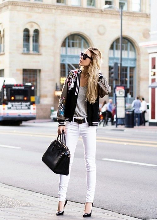 - White bomber jacket - one of the most stylish options that fit almost everything. You can choose contrasting combinations of things, for example, white bomber jackets and sneakers, jeans and a black T-shirt. And you can stay on an elegant bow - white bomber jacket, gray trousers, beige blouse and the same shoes.