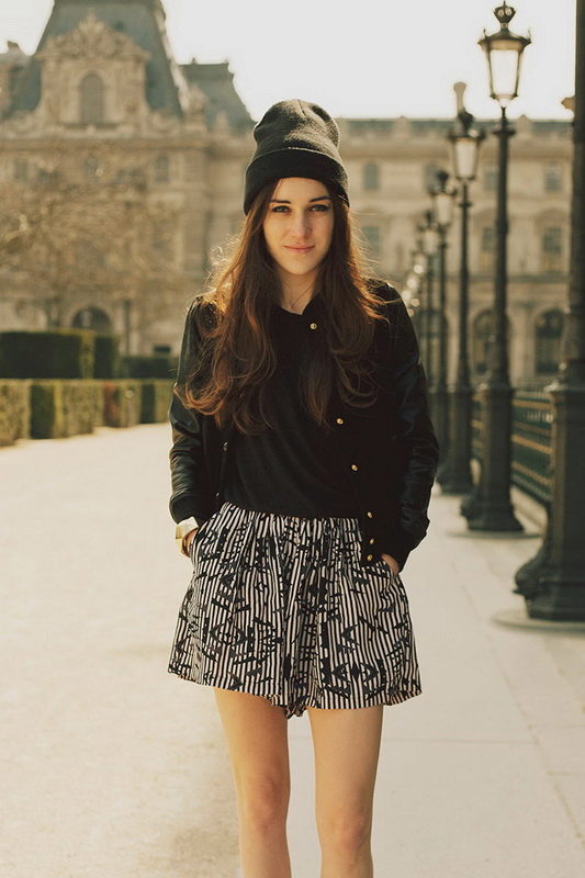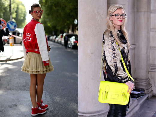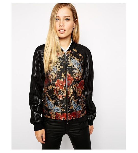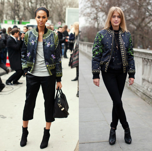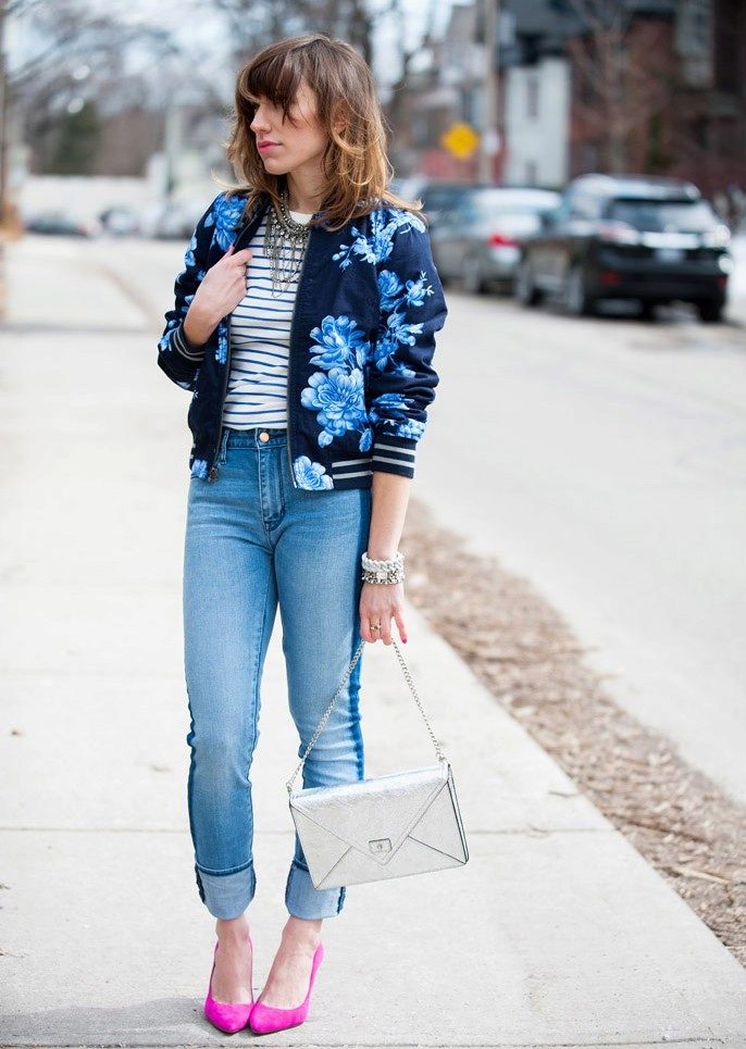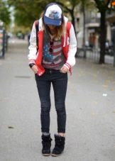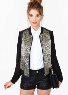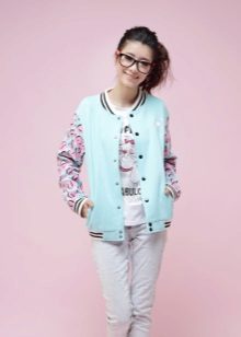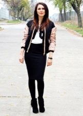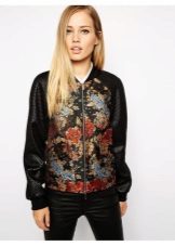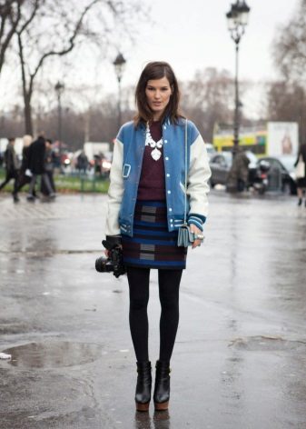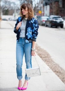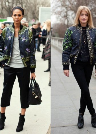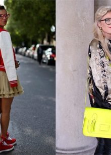 - Separate conversation - fabric bomber jacket with printswhich can be so diverse that in a matter of minutes they will be able to completely transform the image from hooligan to glamorous. A bomber in a cage with leather sleeves in combination with leather trousers, a shirt and boots - right, great? Is a bomber jacket made of paisley pattern, satin trousers, chiffon blouse and heel shoes romantic? A pink Hello Kitty bomber jacket with pink capri pants, a white top and white slip-ons is a pretty girlish, cute look. A dark bomber jacket with a large white floral print, a knee-length pencil skirt, a white blouse with a stand-up collar, platform shoes are an office option.
