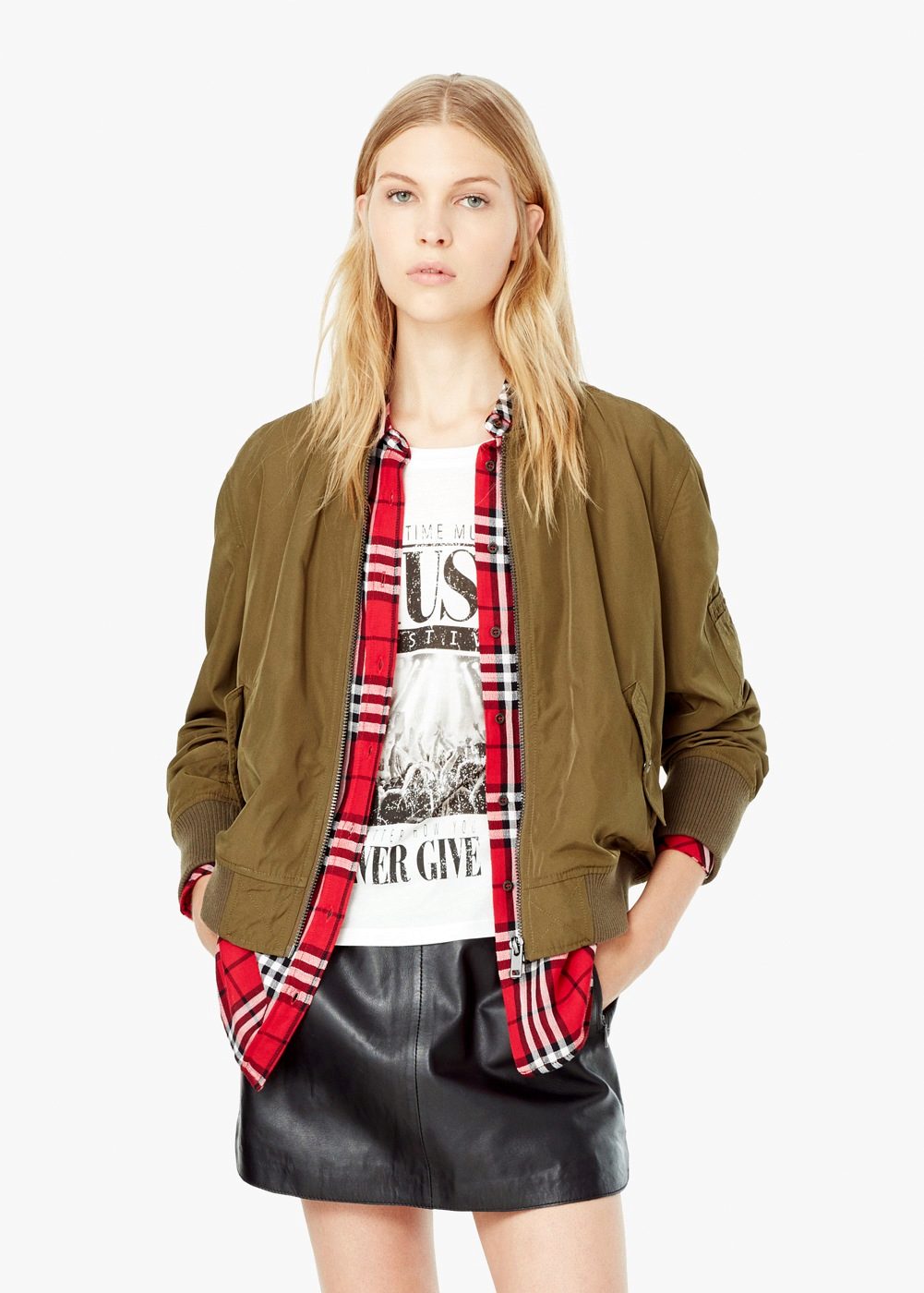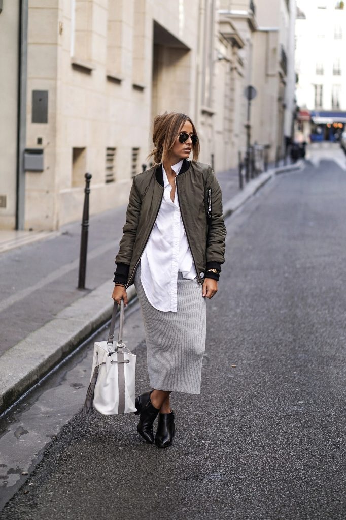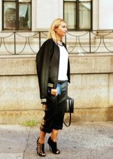 Most people who choose a bomber jacket as an outerwear, still prefer to follow the semi-sports style and put it on, mostly with jeans. But an interesting solution is the combination of a bomber jacket with a narrow skirt, if the fabric and colors of things are taken into account correctly. A monochromatic or two-color bomber jacket with a plaid shirt looks very stylish, especially if the colors of the shirt cells echo the colors of the bomber jacket itself. In the case of a monochrome variant of all things, a beautiful scarf that does not allow to slide into despondency can become a bright accent.