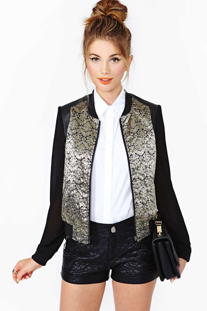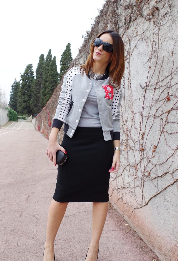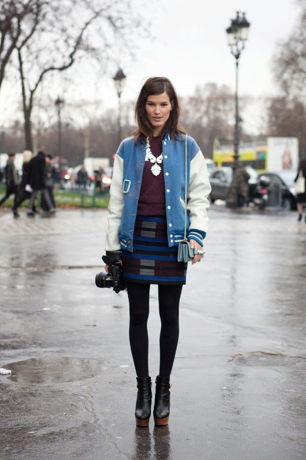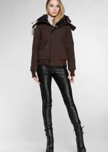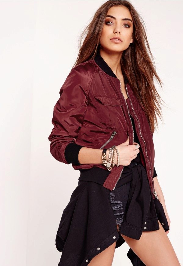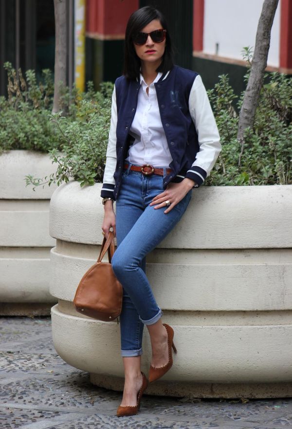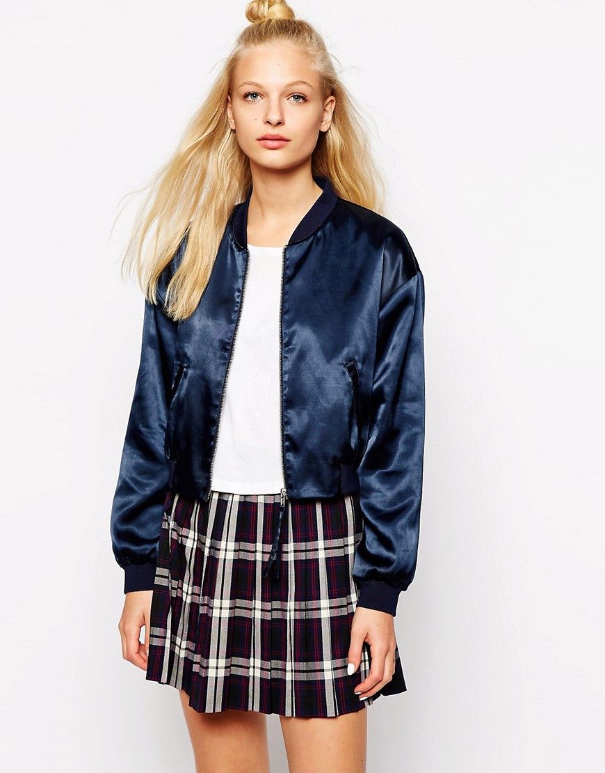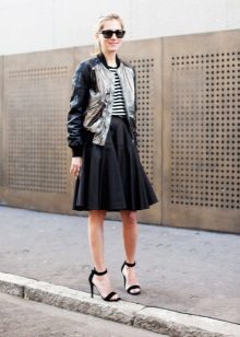 - Short, waist ending, bomber jacket It will be wonderful to look at a slim girl with a pronounced waist and hips. An excellent combination for him would be a short skirt with a high waist, blouse and shoes.