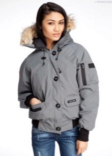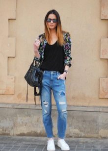 - Bomberber gray. The classics of casual bows are a gray-white sports bomber jacket, jeans, a white T-shirt and sneakers.