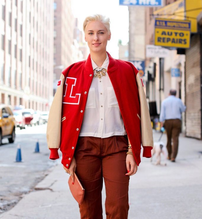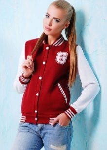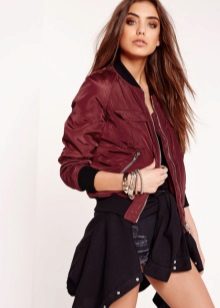 - Red - bright and self-sufficient, bomber this color can be both the main focus of the whole bow, if other things are for him the background (for example, a skirt, a high neck sweater and shoes on a black platform), or one of the components (red bomber jacket with white sleeves, dark red jeans, white t-shirt and sneakers of the same color).