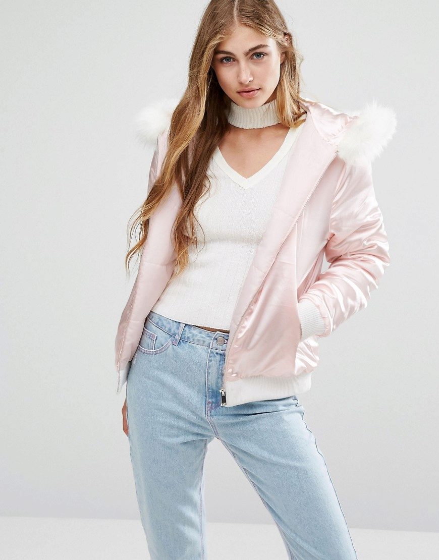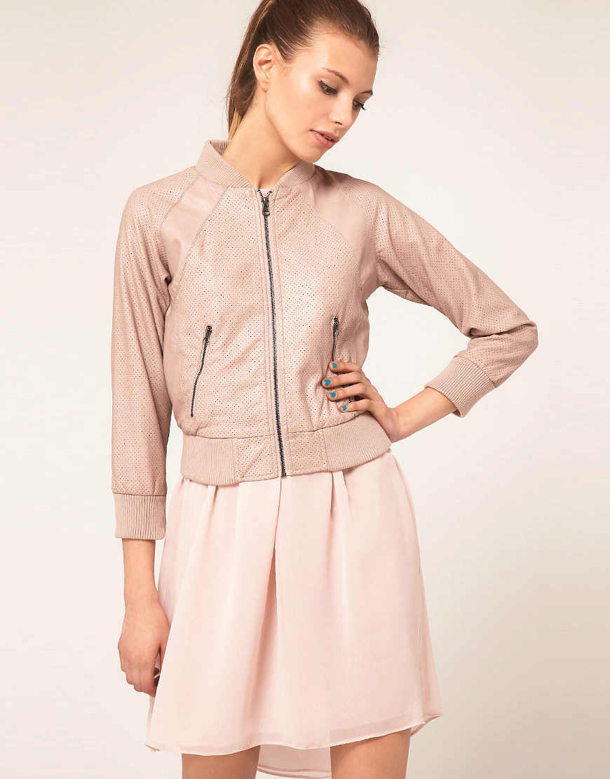 - Pink with white bomber jacket - a find for young ladies. A model made in such a color scheme can suit both blue jeans and a romantic dress in pastel colors with a wide skirt, and regardless of the chosen one, you can safely wear white sleepers and high-heeled shoes.