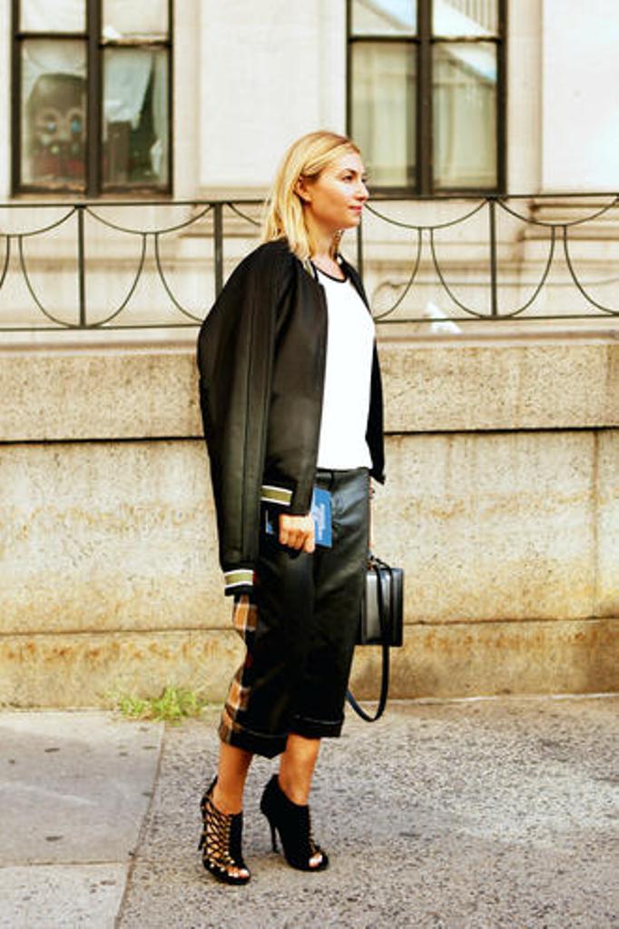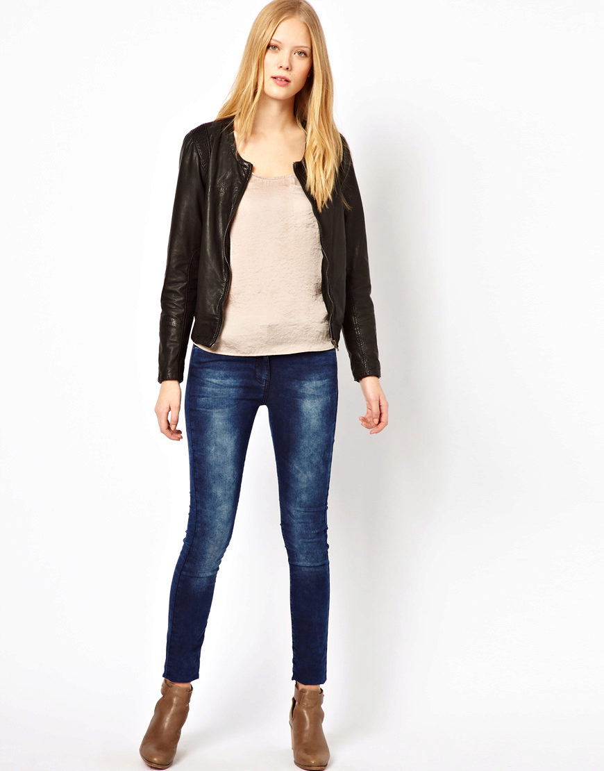 - An elongated khaki leather bomber jacket with a sleeve of an unusual cut and stitching that imitates a shawl collar with regular jeans, a black top and boots.