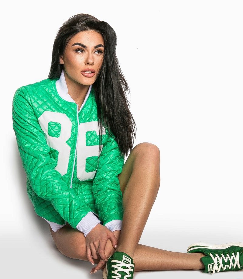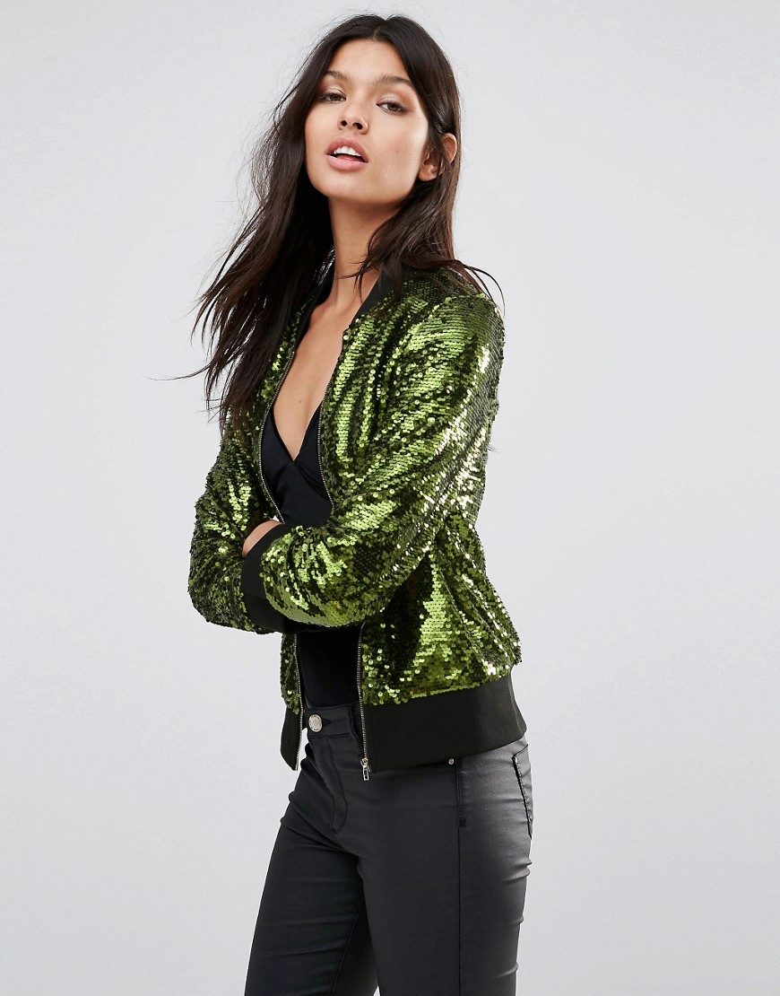 - Green color bomber, whether it is a cheerful green or exquisite emerald green, it requires the same life-affirming shades and from other things - lemon top, narrow brown jeans, platform sneakers or a bright yellow blouse, brown velvet skirt and tonal shoes.