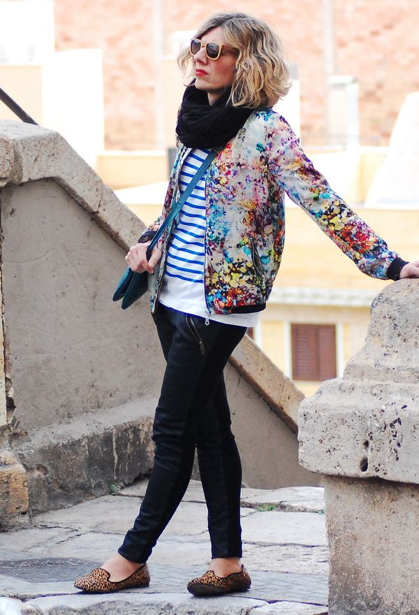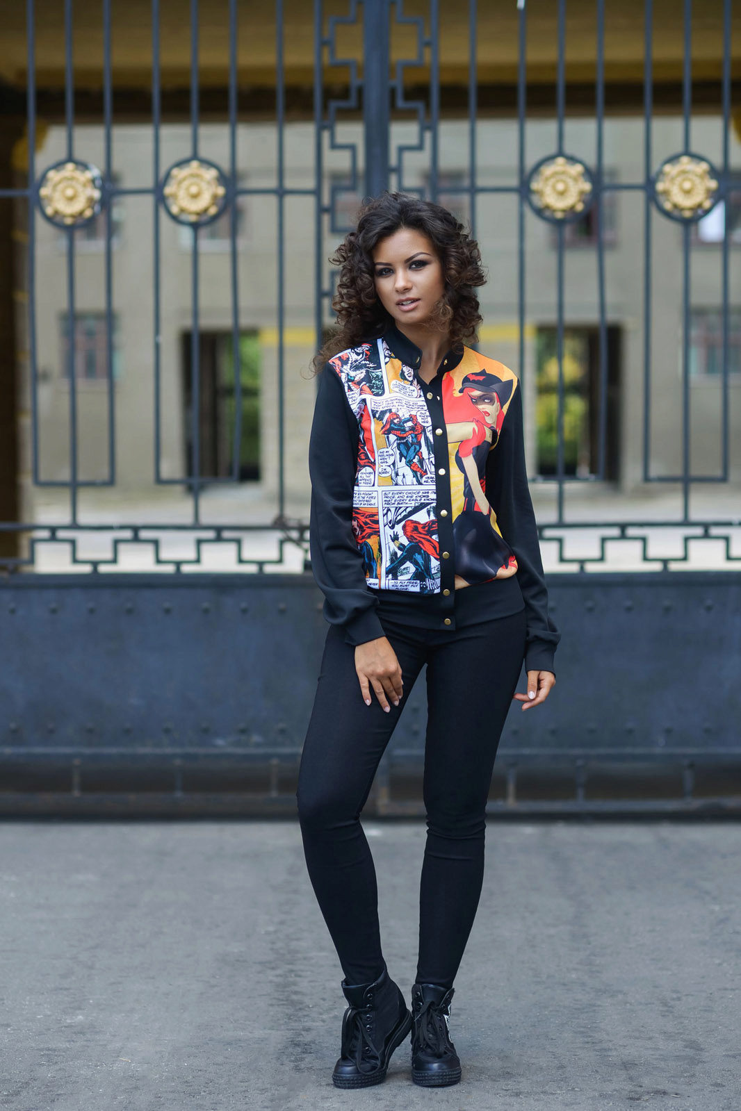 - A bomber jacket with a bright print “Comics” and dark blue sleeves in combination with leggings of the same tone and black low-heeled shoes.