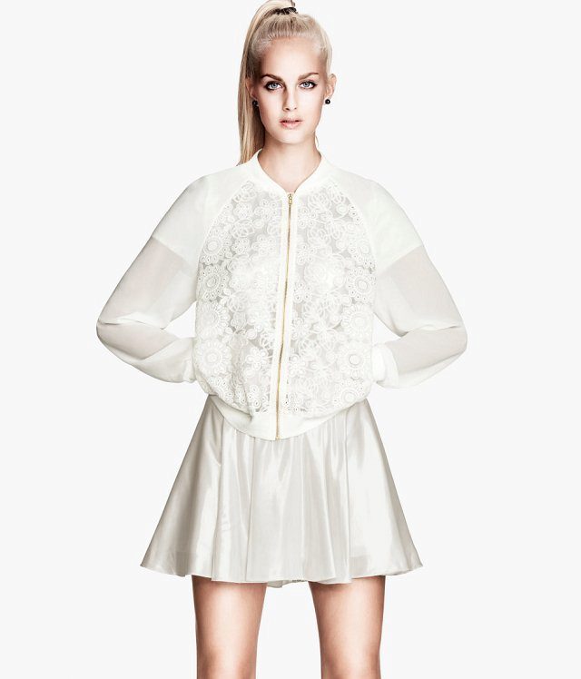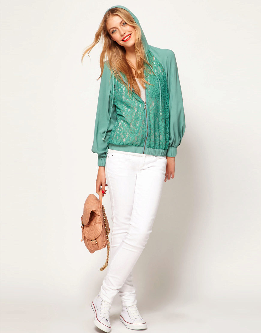 Lace bomber jacket is great for creating a boho style bow., one of the most extraordinary modern styles. The tender jacket and heavy grinders, elegant lace and heavy skirt with draperies, wonderful lace, skirt-balloon, ankle boots and woolen knee-high socks - it is scary to read and looks great. There may be softer, but the same spectacular options - a sports bomber jacket made of lace with knitted sleeves, jeans, a T-shirt and sneakers made of a material that imitates all the same lace.