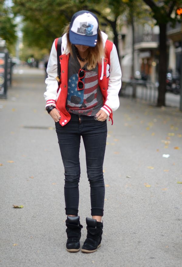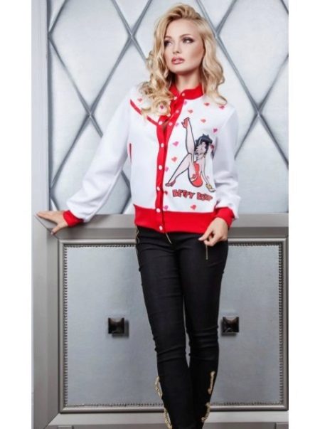 - The glamor and sports look of a red and white bomber jacket with a Betty print, wonderful jeans with a décor at the bottom, and red stilettos.