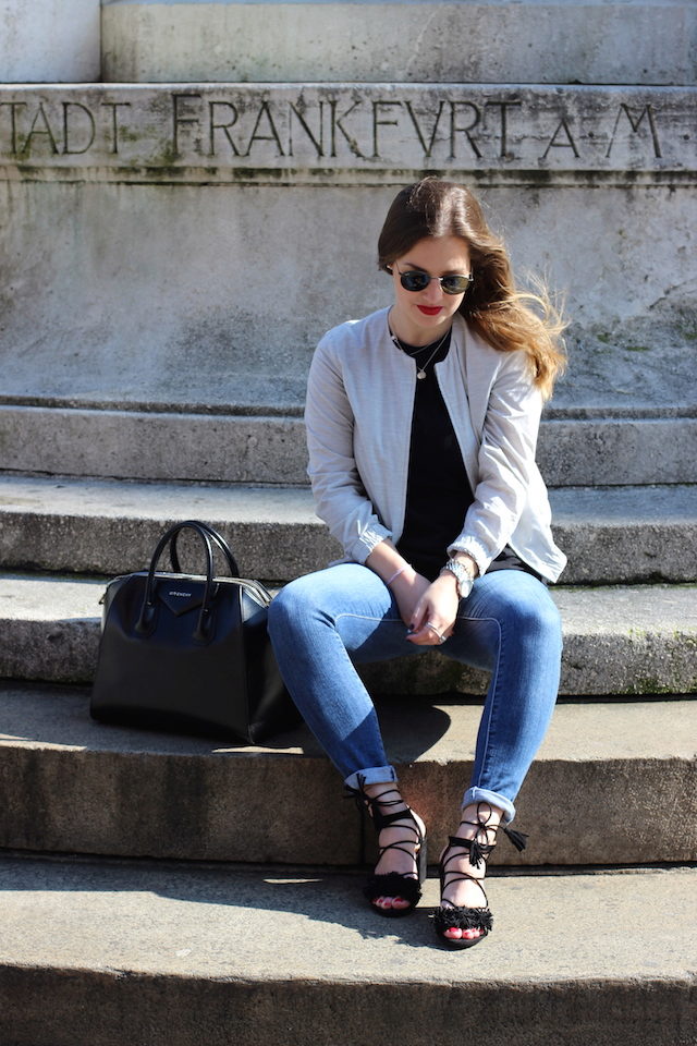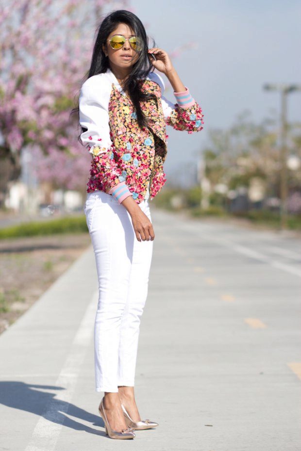 - Beautiful bow - white skinny jeans, gray top, golden stilettos and a bomber jacket embroidered with small flowers.