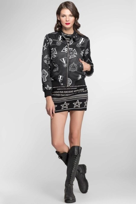 - Unusual image of a black satin bomber with a white geometric print, a short dress made of the same fabric and high, rough lace-up boots.