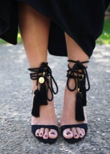 Having added black sandals, the dress in which red color prevails it is possible to receive a bright evening image. Black sandals can be combined with black things, but so that the outfit does not look too gloomy, it is advisable to add interesting accessories of rich colors.