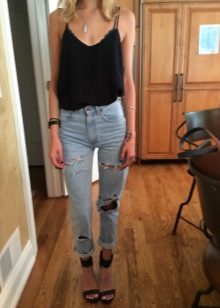 It is worth paying attention to the model of sandals, the heel is closed, and the top as if consists of interlacing straps, which seductively reveal the fair skin. It is sandals that make this look more feminine and sexy. The sunny summer look consists of a long yellow skirt and a light top. Black sandals with thick heels and a small black clutch complete the stylish look.