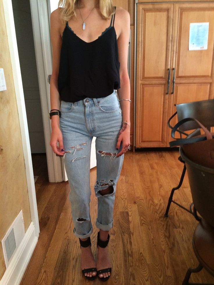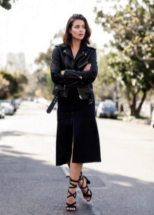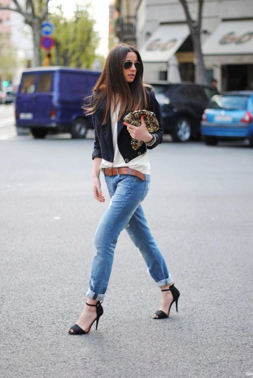 The free image created with the help of jeans - boyfriends, black leather jacket and oversized sweaters unexpectedly stylishly complement the black stiletto sandals.