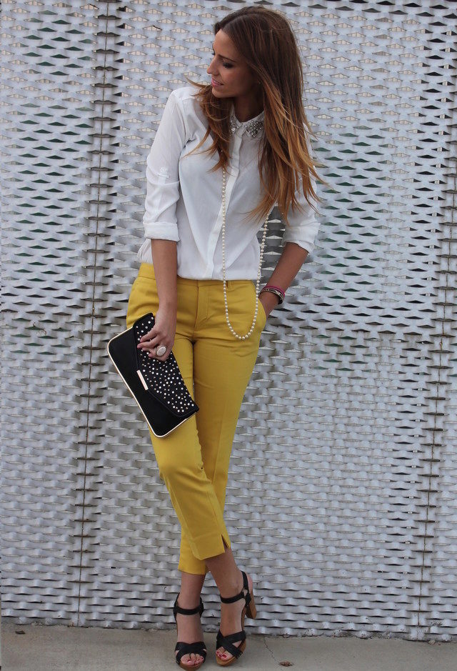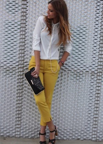 Black always looks good paired with yellow. For example, if you add yellow cropped trousers and a white blouse with black sandals, a black handbag and a belt, you will get a stylish look. Black shoes and black accessories will contrast with light-colored clothing to attract attention.