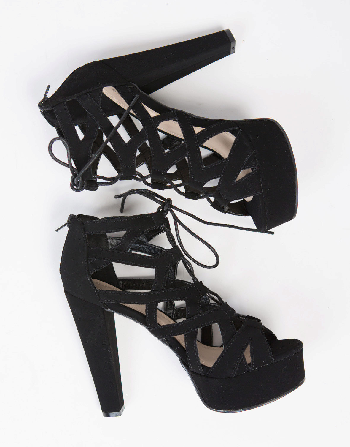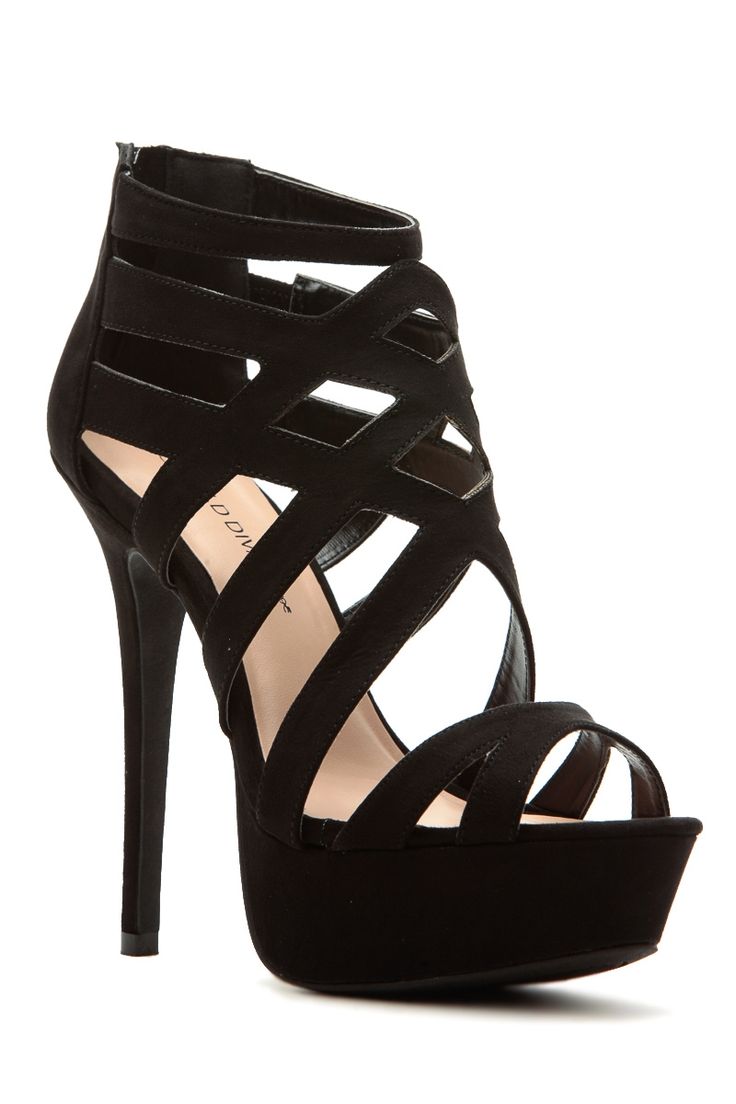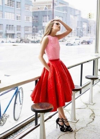 A black suede stiletto heel sandals accent the romance look of a pink short top and a lush red skirt. This combination does not need additional accessories, it is difficult not to notice.