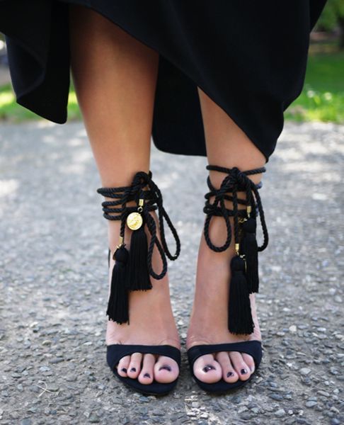 Classic black sandals are perfectly combined with things of white and red colors. You can combine black, white and red in different proportions depending on the image you need to get. If the dress is more white things, then you get an elegant look, suitable for an office or business meeting. The image can be completed by picking up accessories of red or black colors.