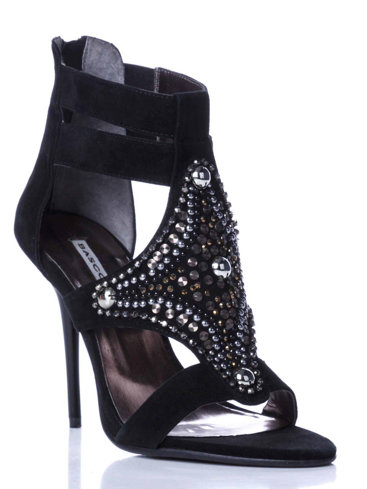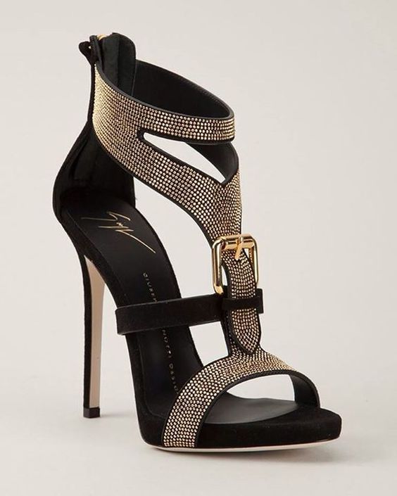 A black brocade dress made of gold brocade or shining satin will complement perfectly the black suede sandals.