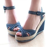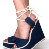 The fashion industry today offers jeans sandals of various models. Looks stylishly on the wedge, especially if it is made of light and practical cork. By the way, natural cork is quite expensive, so it is often replaced with cheaper artificial counterparts, which, however, is not at all inferior in quality. No less attractive look sandals on the wooden wedge, which can be simply covered with denim. Model on the wedge often clasped on elegant ankle straps.