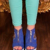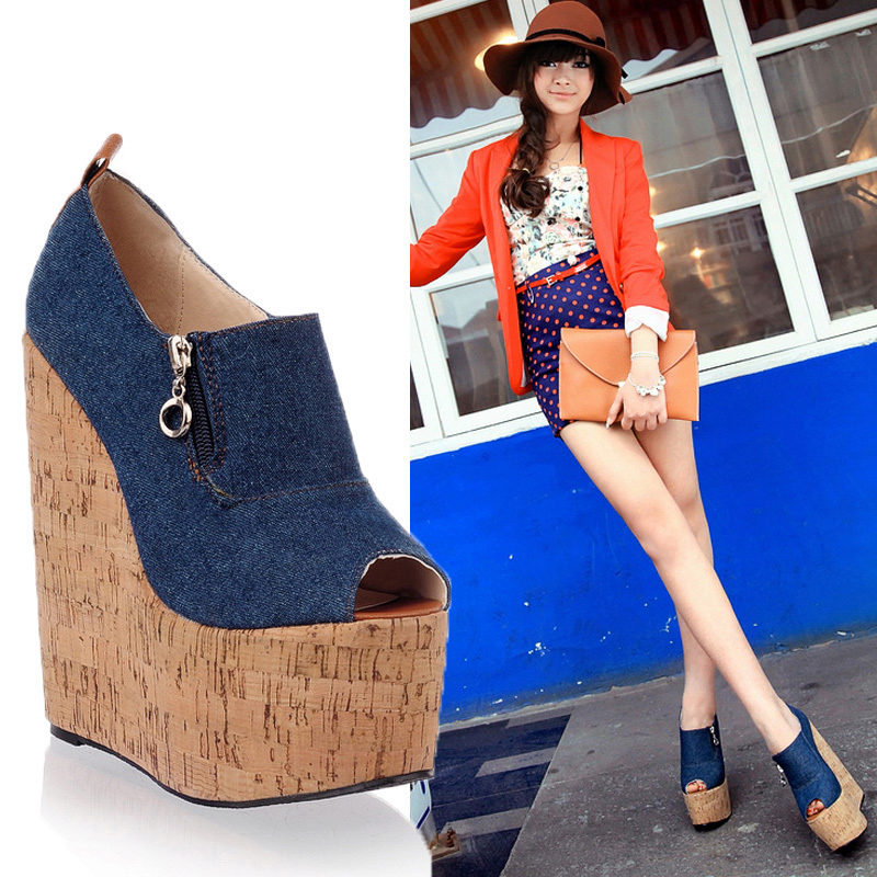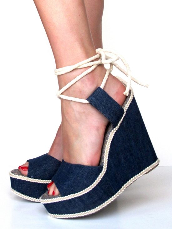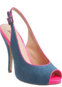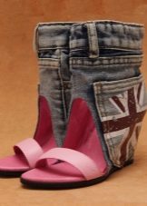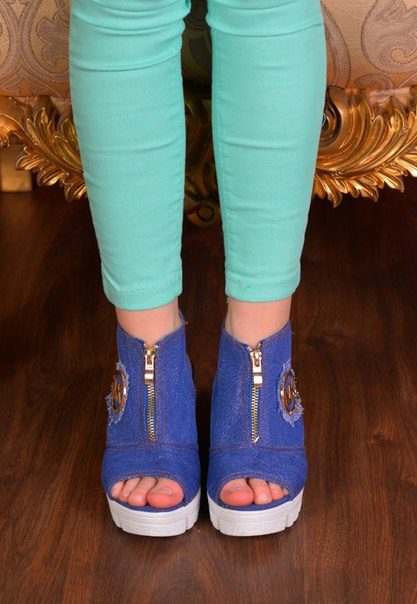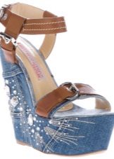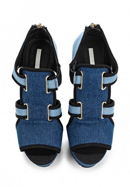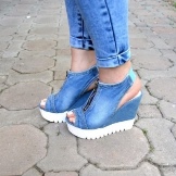 - Choosing denim sandals, give preference to the bright shade of the pads, because it is the most harmoniously combined with denim. Choose the shade of denim to your liking: the shops offer a variety of shades: from light blue to dark blue.