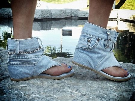 Any girl with elementary sewing skills will be able to make her own denim sandals by herself. The main advantage of this shoe is that it is inexpensive. For the summer season more than one such pair can be made, for example, with different types of soles.