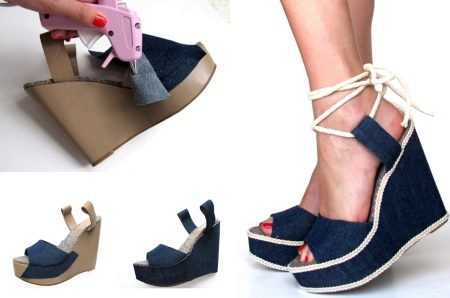 First, with old shoes need to carefully cut the straps or straps. On the sides in the sole you need to make cuts into which denim is inserted. It can be one wide strip or two or three narrower ones - they will hold the toes. The length of the strips must be carefully measured out according to the completeness of your foot: it is important not to allow the legs to hang loose or to compress them too much.The material is fixed with a special glue for shoes: you need to fix it in the cuts and fix it with a vise until it is completely dry.