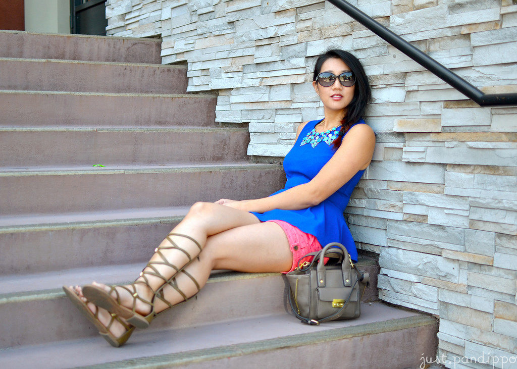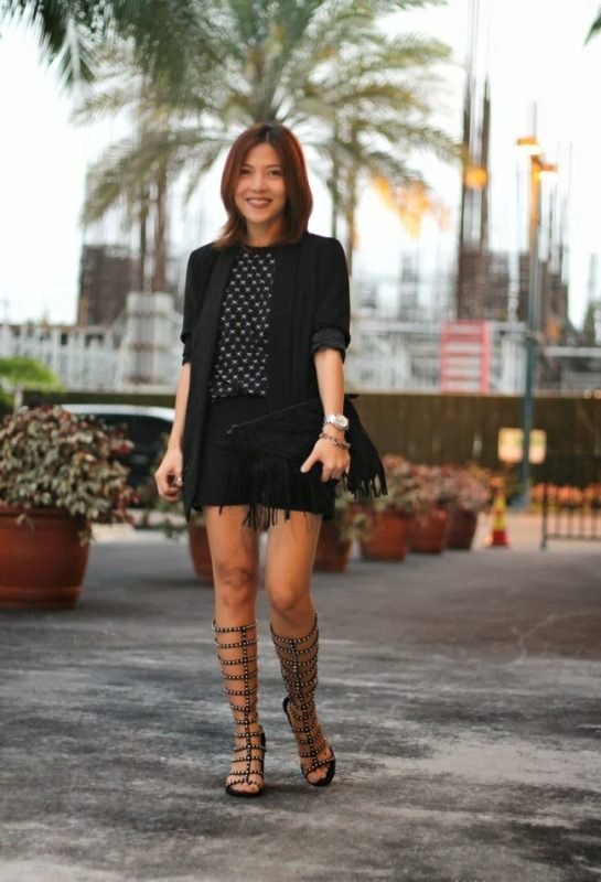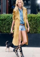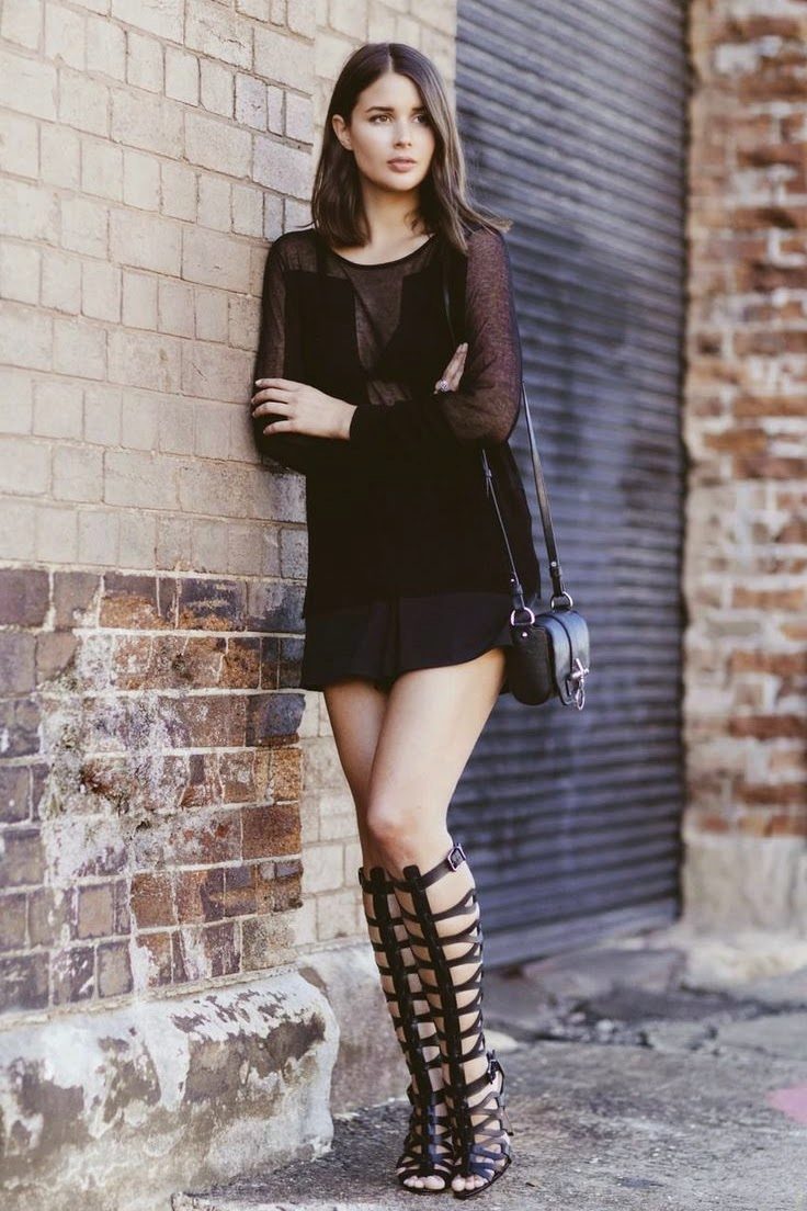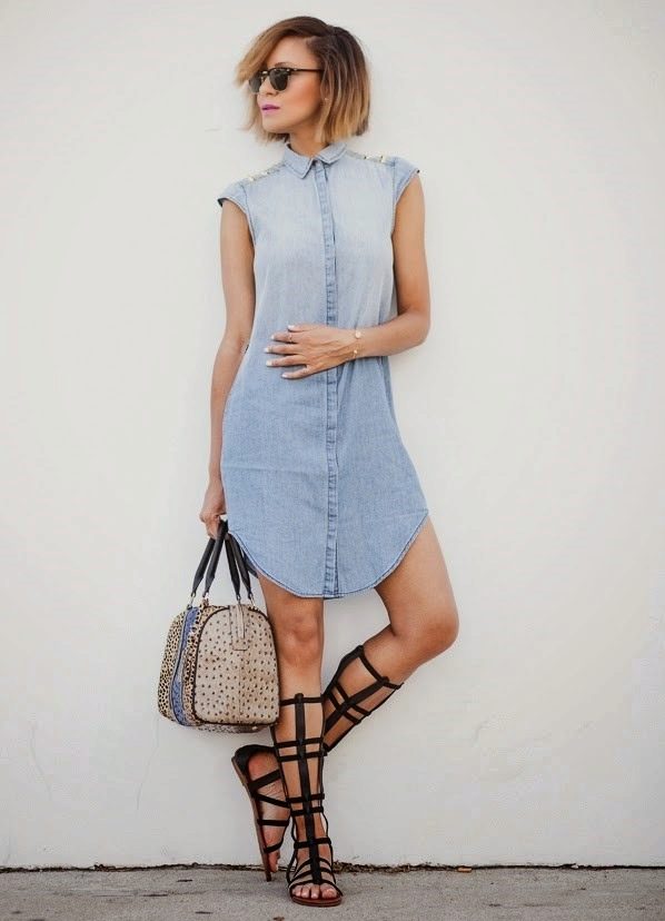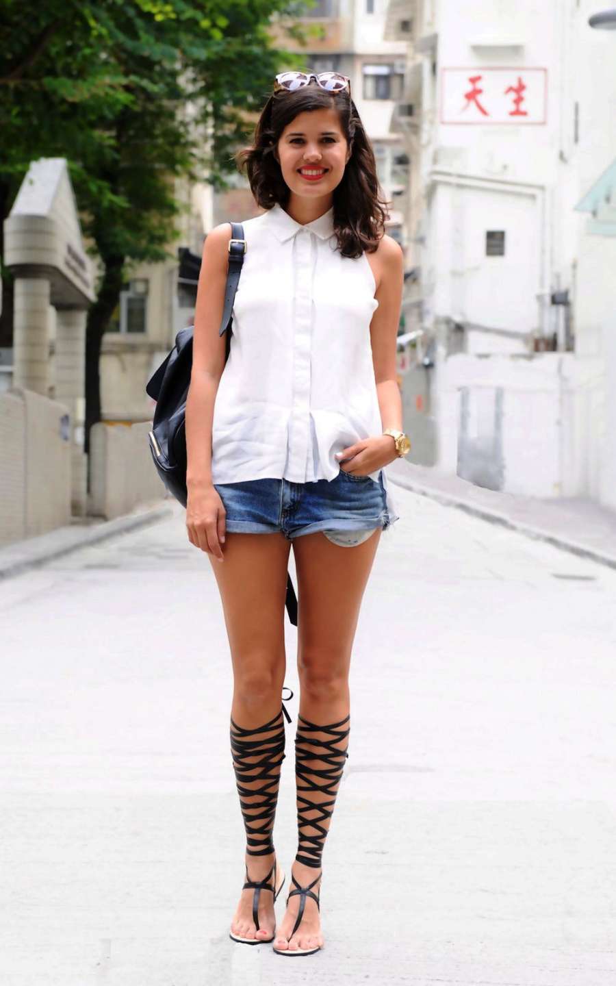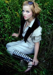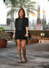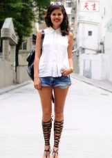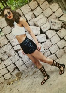 For ladies who prefer the casual style, the best solution would be a loose shirt or an “alcoholic” T-shirt in combination with denim shorts or a mini skirt. Since the "gladiators" on a flat sole are ideal shoes for long walks, it is not forbidden to add a little sport to the image, wearing a fiery T-shirt or leggings with them. The latter, of course, are permissible only if the sandals are below the ankle.
