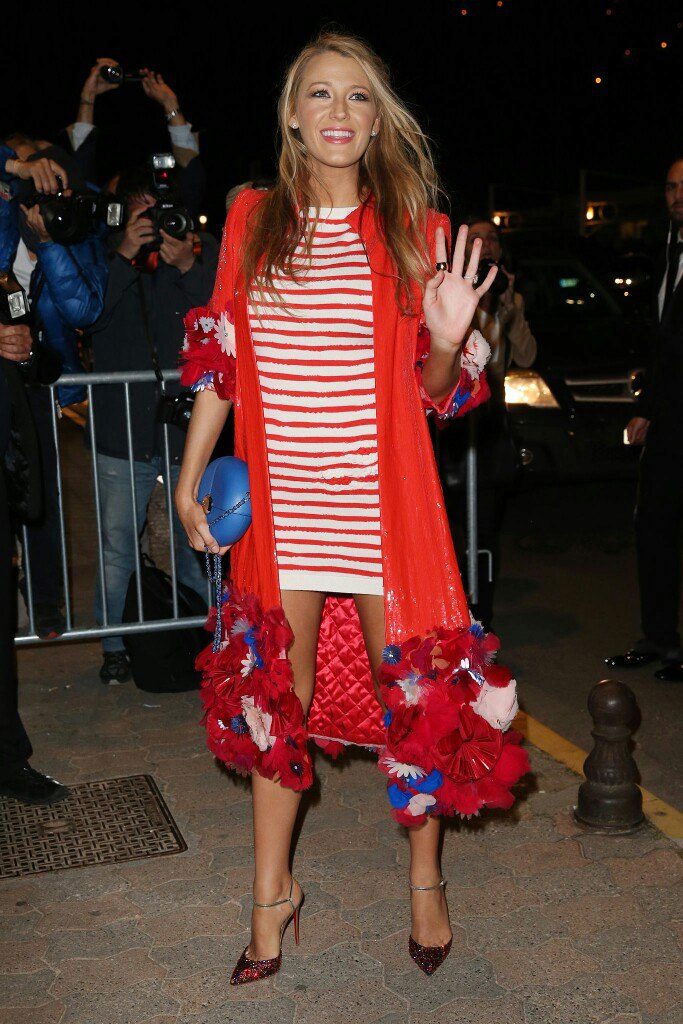 Blake Lively's luxury look at the Cannes Film Festival: elegant golden sandals and a long dress with a Versace train. At VanityFair dinner, the actress picked up a very bright bow, and sandals with a closed nose, studded with iridescent rhinestones, gracefully complemented the image. Carolina Herera dress and white stiletto sandals with a thin strap around the ankle made Blake Lively look very youthful on the red carpet.