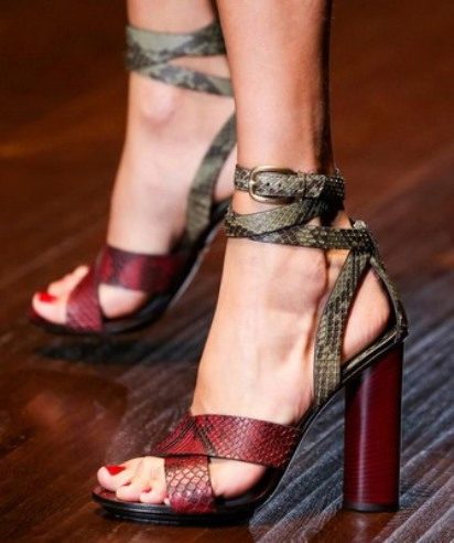 A great option for confident and stylish women are presented in sandals embossed under snake skin, on a small thin platform and a steady heel-cylinder. Contrast straps in the form of a red jumper with a cross and a spectacular back with spiral straps in green look harmoniously. The heel has something in common with the cross lintel in color - red. The color combination is not too bright, but rather muffled with a snake-patterned skin. This model is suitable for office, publication.
