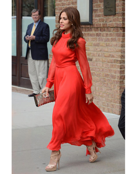 Scarlet sandals on heels will make a discreet business attire brighter and more exciting. As suitable accessories along with, you can choose an elegant strap or a bright bracelet to match the shoes.
