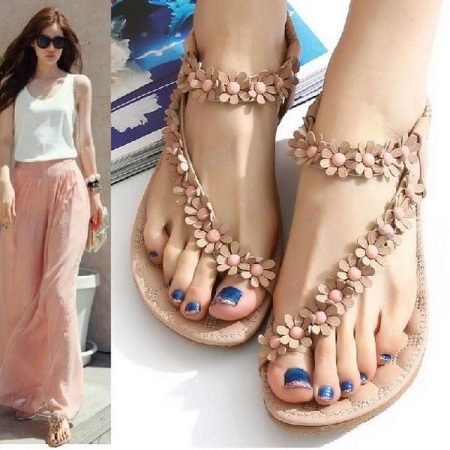 Flat sandals - ideal not only for every day. Richly decorated models can become part of the evening look. For example, in combination with a long, flowing dress in the Greek style.