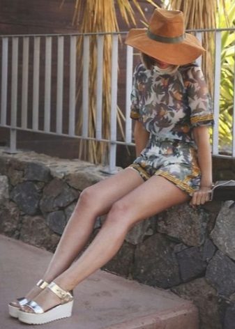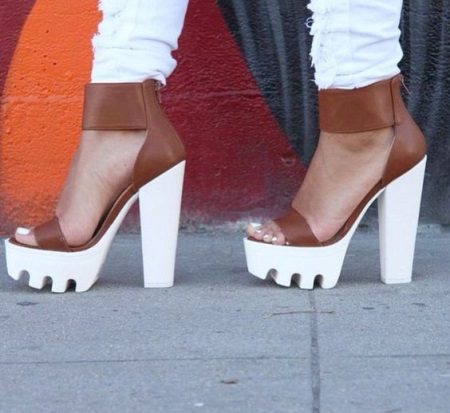 Sandals on a tractor sole with a heel are not bad combined with summer overalls, skirts with a high waist, a dress-shirt, shorts.