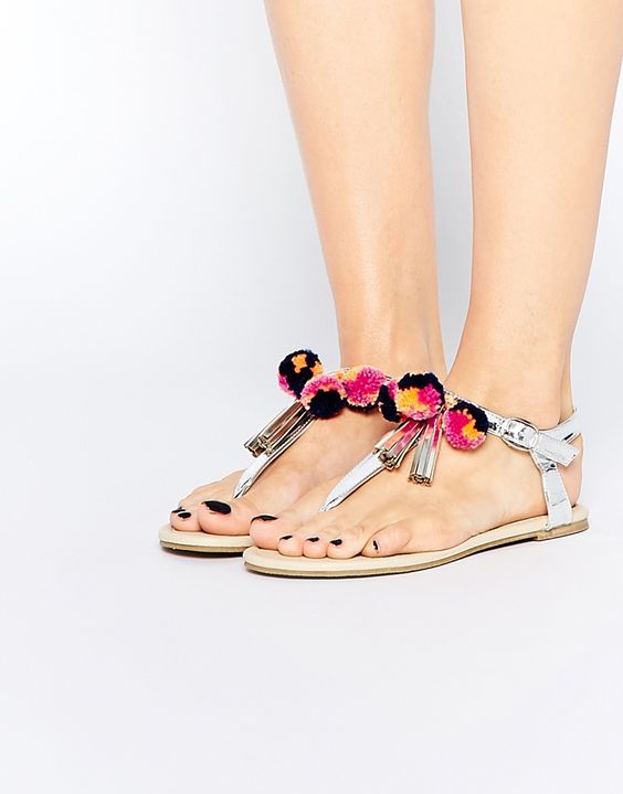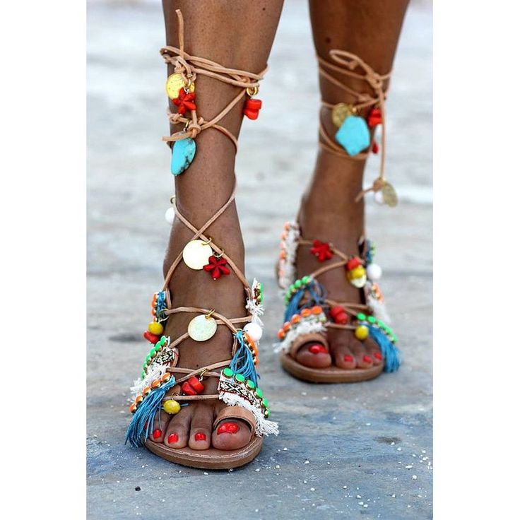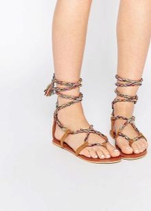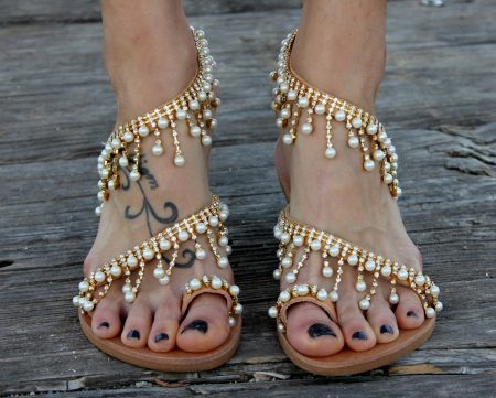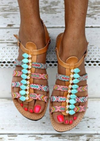 The principles of decor low-heeled sandals do not differ much from the decor of the rest of the summer shoes. Fringe, tassels, ribbons, rhinestones, stones and everything that the designer’s imagination is enough serve as decorative elements.