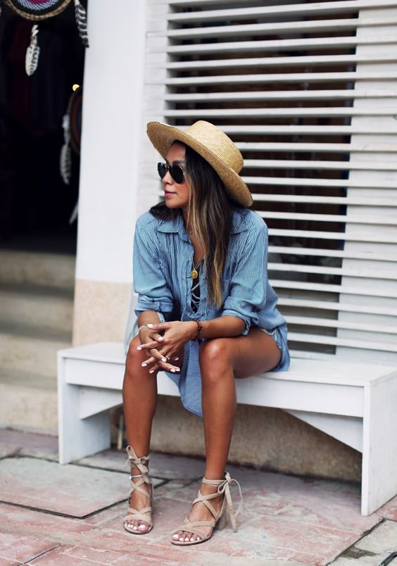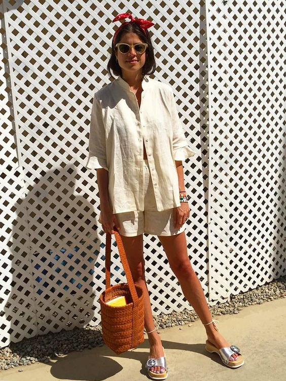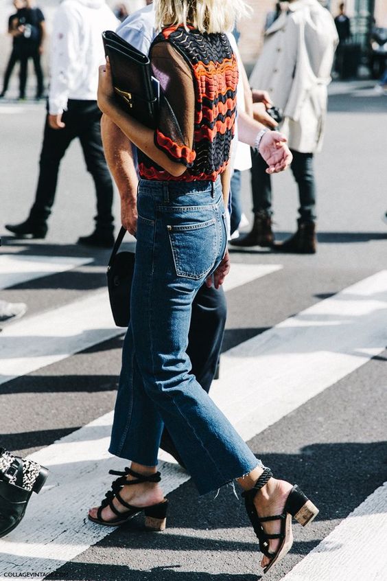 Or blue jeans of a classic cut with closed sandals during the day and woven or decorated in the evening.